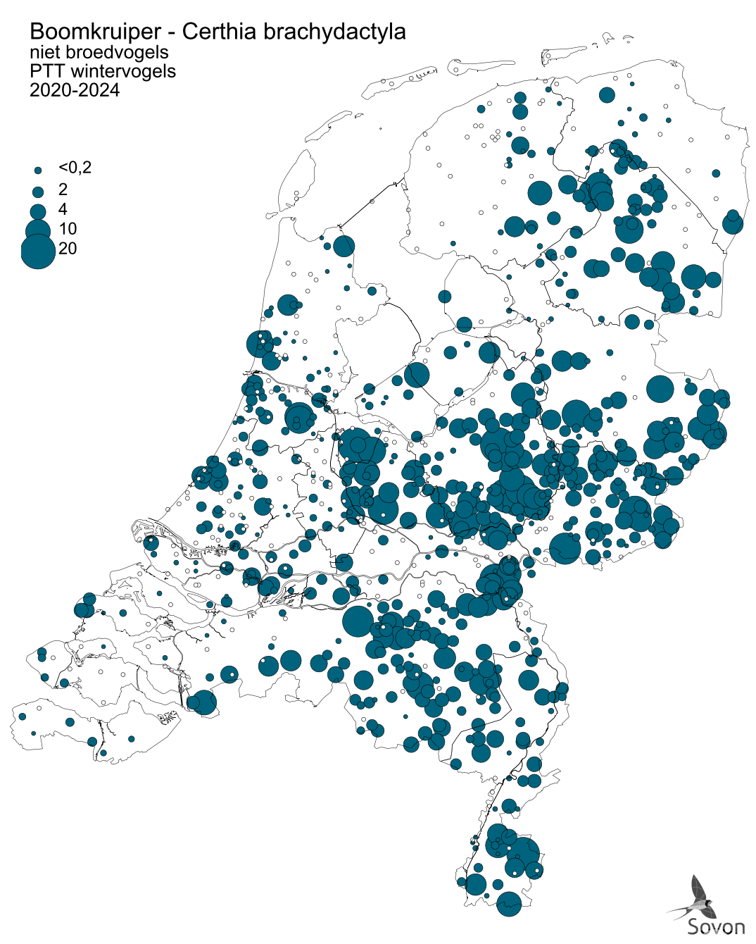 Deze kaart is gebaseerd op het Punt Transect Tellingen project (PTT). Weergegeven is het gemiddeld aantal exemplaren per telroute. Routes waar de soort niet is waargenomen zijn apart aangegeven (geen landelijke dekking).