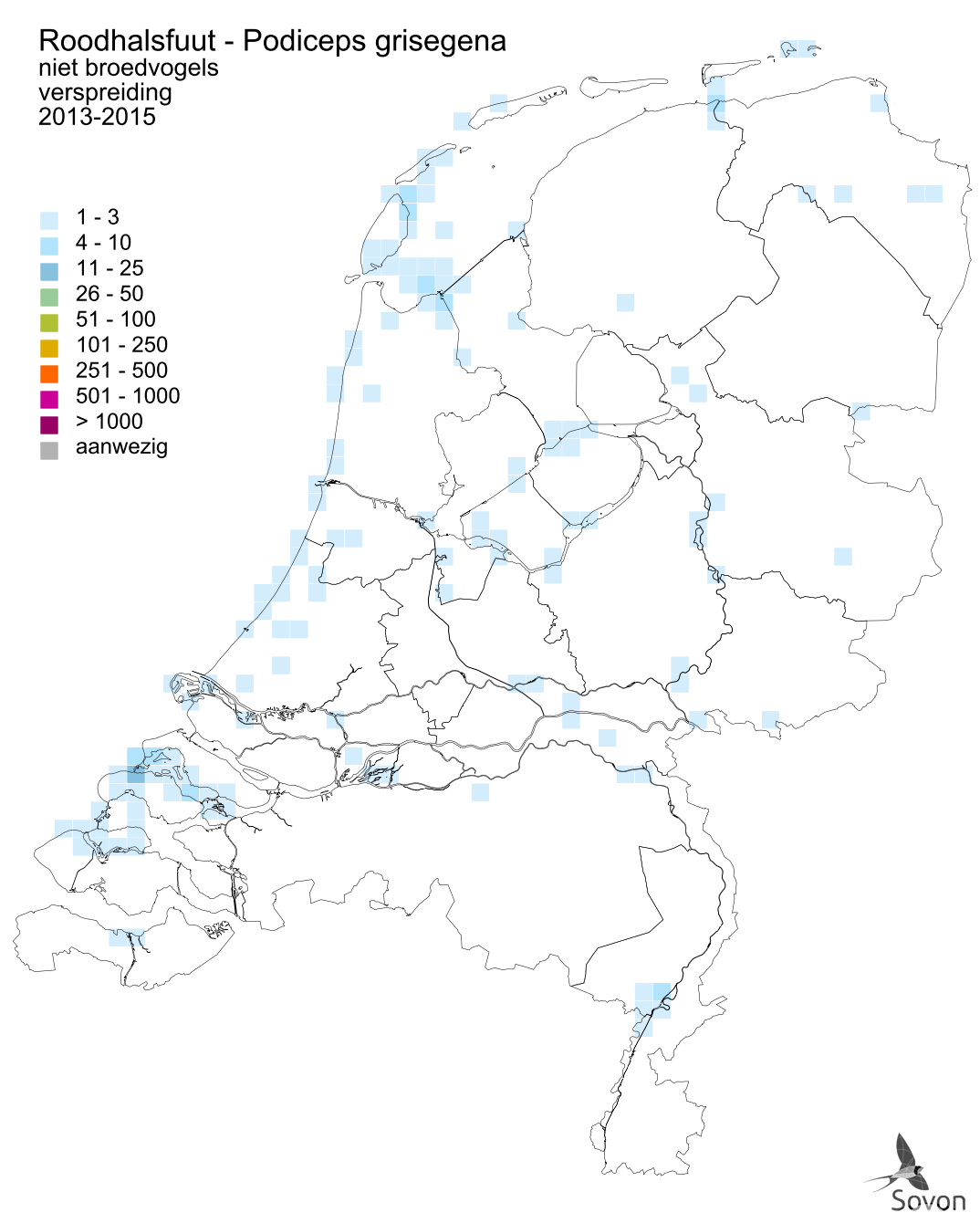 Deze kaart is gebaseerd op de Vogelatlas van Nederland (Sovon 2018). Per atlasblok van 5x5 km is er een schatting van het aantal individuen gegeven.