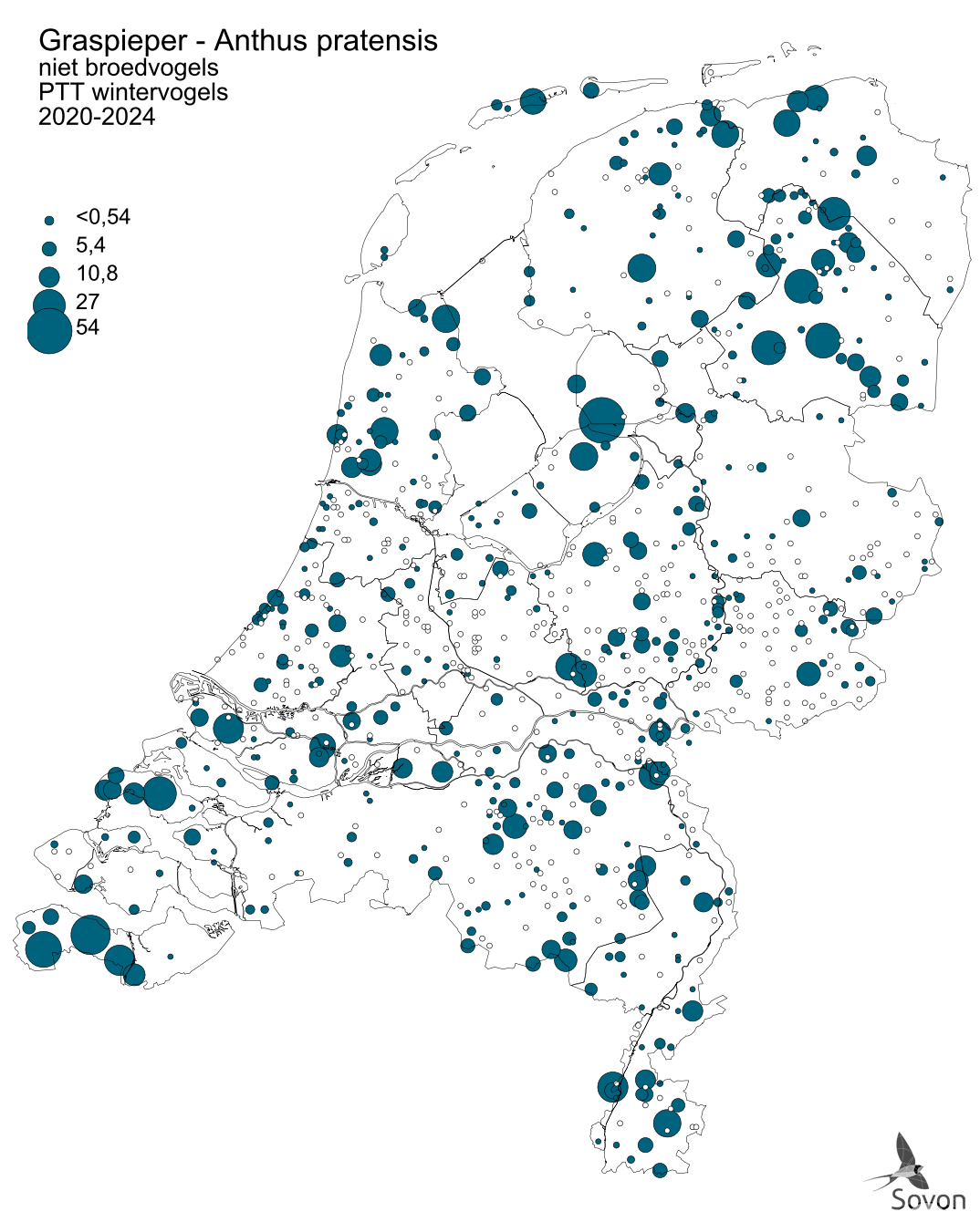 Deze kaart is gebaseerd op het Punt Transect Tellingen project (PTT). Weergegeven is het gemiddeld aantal exemplaren per telroute. Routes waar de soort niet is waargenomen zijn apart aangegeven (geen landelijke dekking).