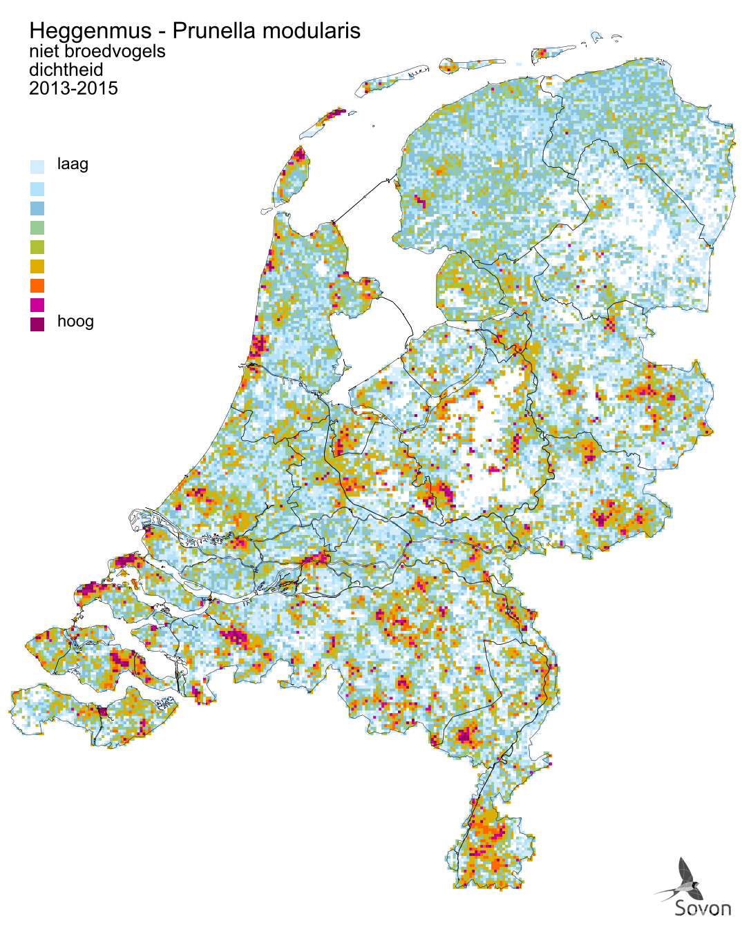 Deze kaart is gebaseerd op de Vogelatlas van Nederland (Sovon 2018). Weergegeven is de relatieve dichtheid per vierkante kilometer.
