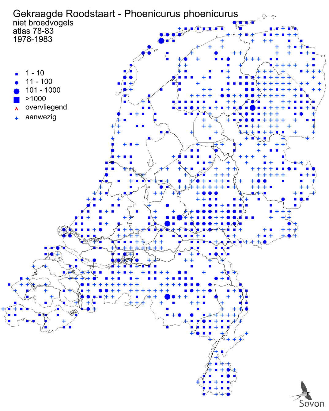 This chart is based on the Atlas of the Dutch Birds (1987), an estimate of the numbers present is given for each atlas square of 5x5 km.