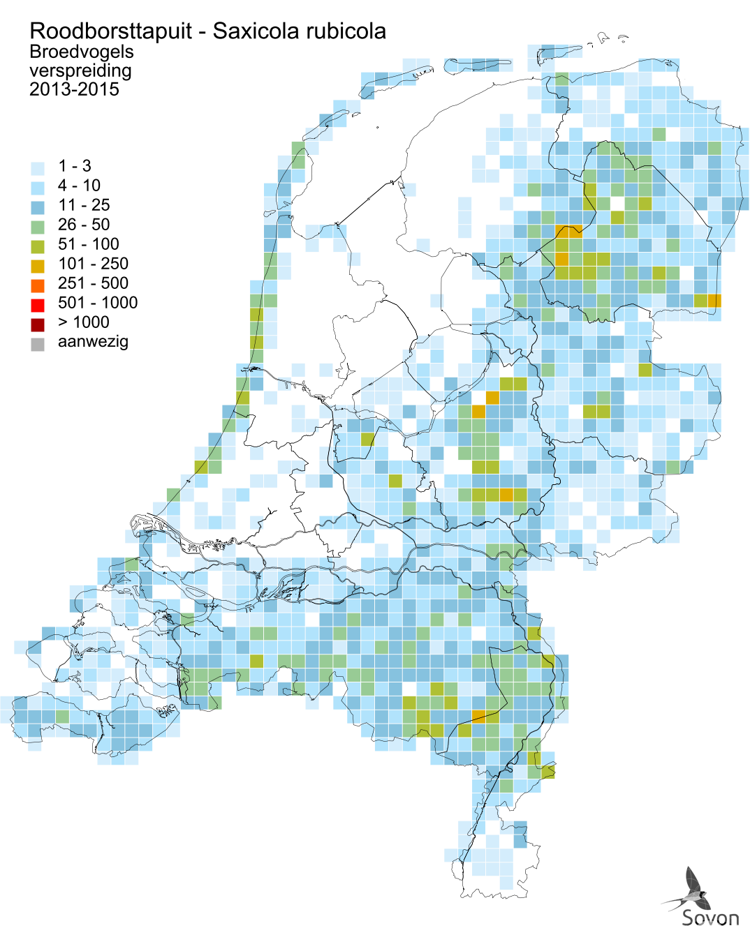 Deze kaart is gebaseerd op de Vogelatlas van Nederland (Sovon 2018). Per atlasblok van 5x5 km is er een schatting van het aantal individuen gegeven.