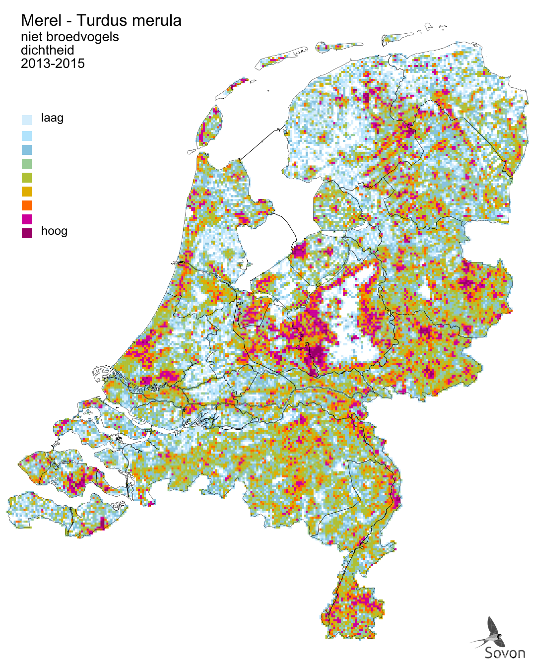 Deze kaart is gebaseerd op de Vogelatlas van Nederland (Sovon 2018). Weergegeven is de relatieve dichtheid per vierkante kilometer.