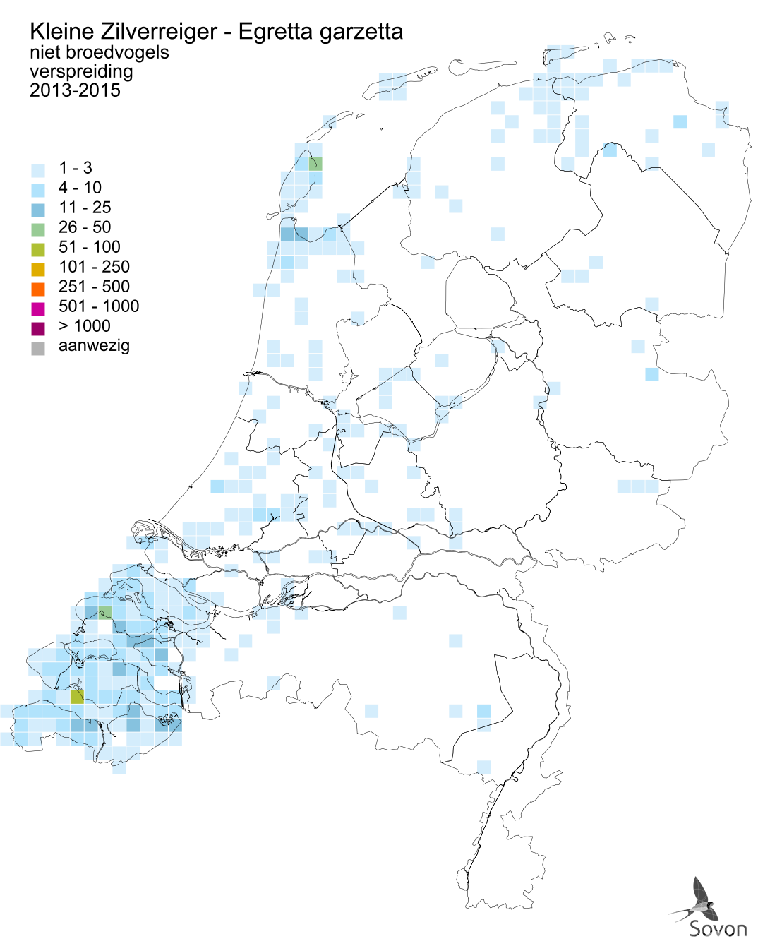 This map is derived from the Bird Atlas of the Netherlands (Sovon 2018). For each atlas square of 5x5 km, an estimate for the number of wintering birds is given.