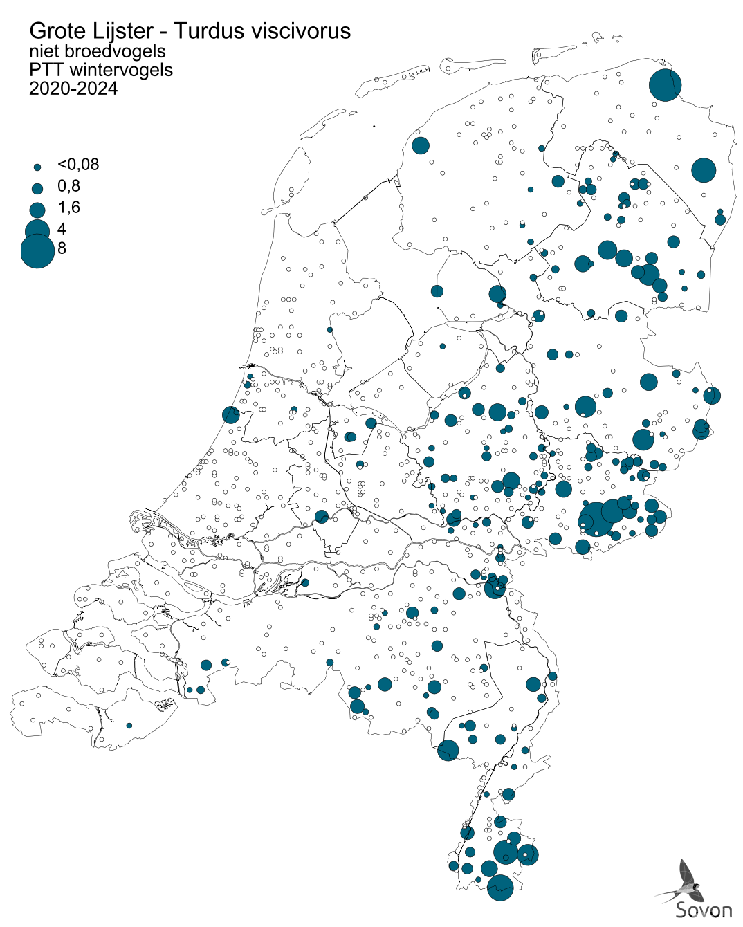 Deze kaart is gebaseerd op het Punt Transect Tellingen project (PTT). Weergegeven is het gemiddeld aantal exemplaren per telroute. Routes waar de soort niet is waargenomen zijn apart aangegeven (geen landelijke dekking).