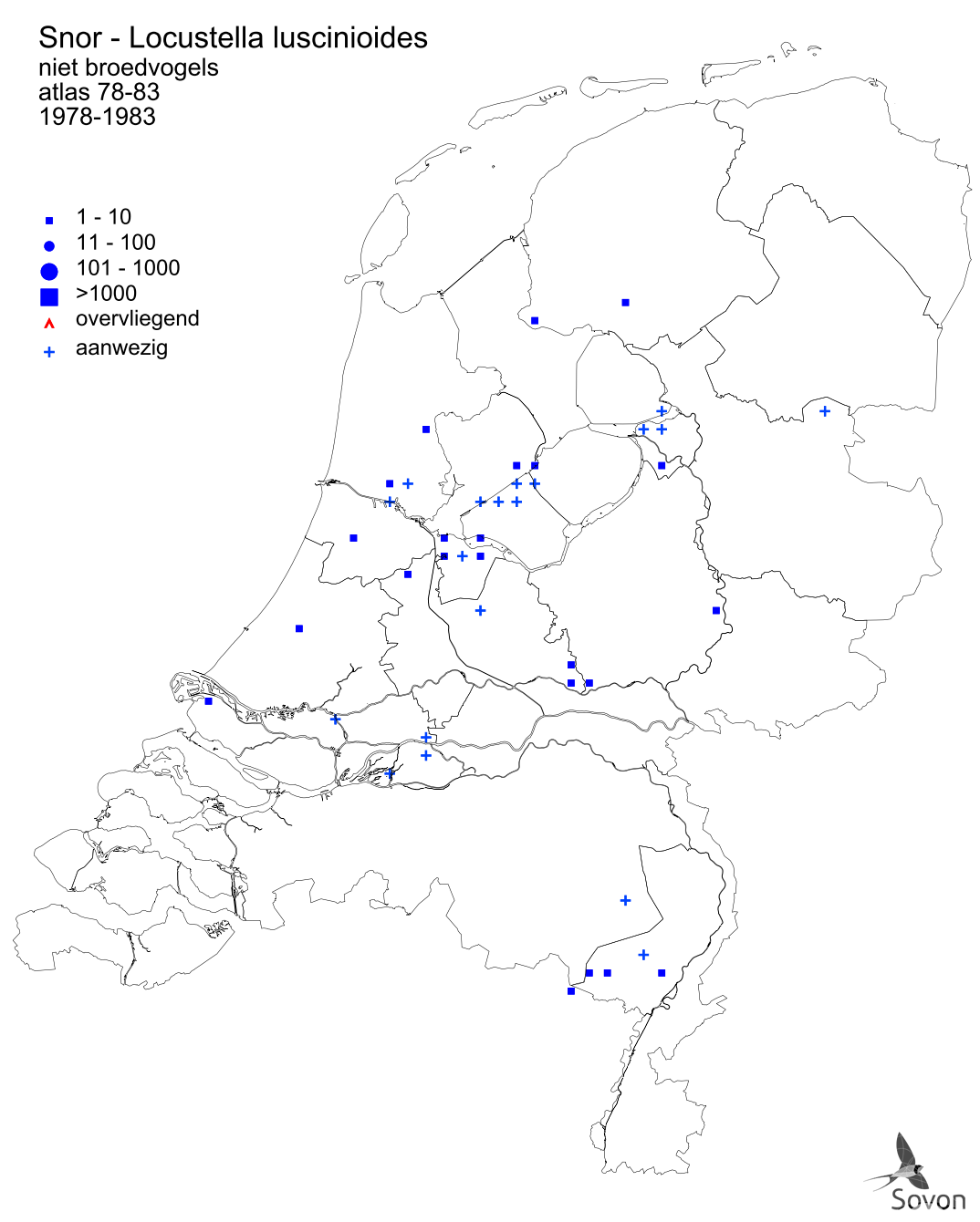 Deze kaart is gebaseerd op de Atlas van de Nederlandse Vogels (1987). Per atlasblok van 5x5 km wordt een schatting van de aanwezige aantallen gegeven.