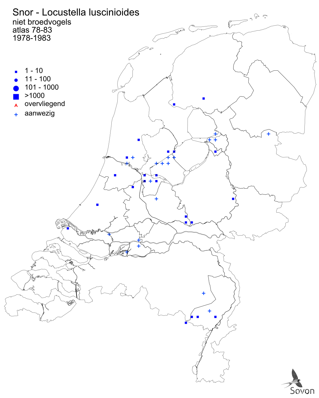 Deze kaart is gebaseerd op de Atlas van de Nederlandse Vogels (1987). Per atlasblok van 5x5 km wordt een schatting van de aanwezige aantallen gegeven.