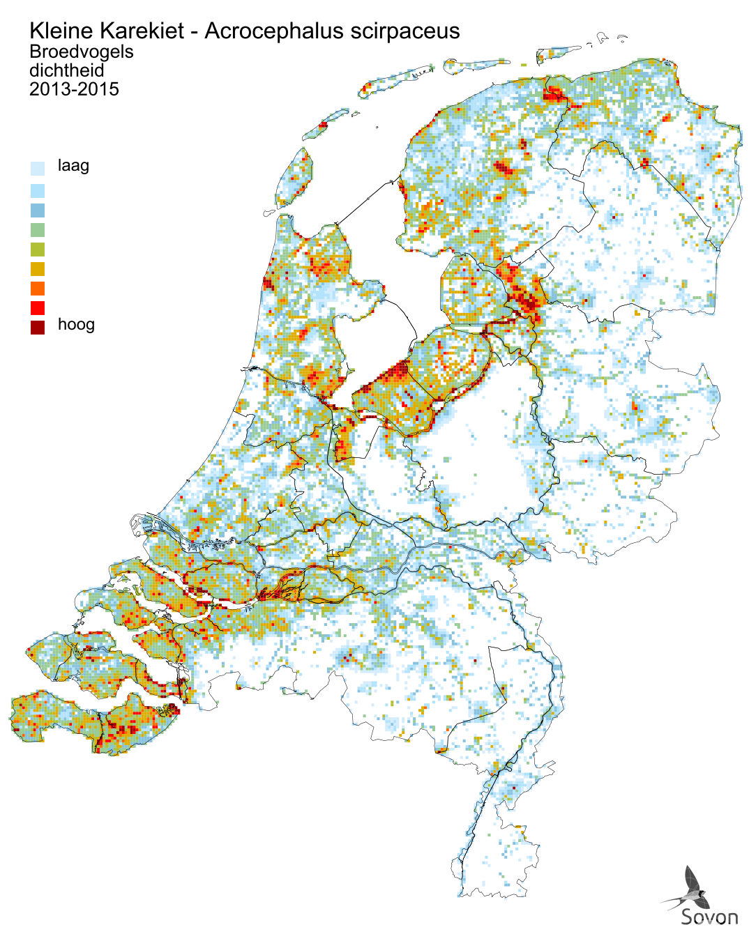 Deze kaart is gebaseerd op de Vogelatlas van Nederland (Sovon 2018). Weergegeven is de relatieve dichtheid per vierkante kilometer.