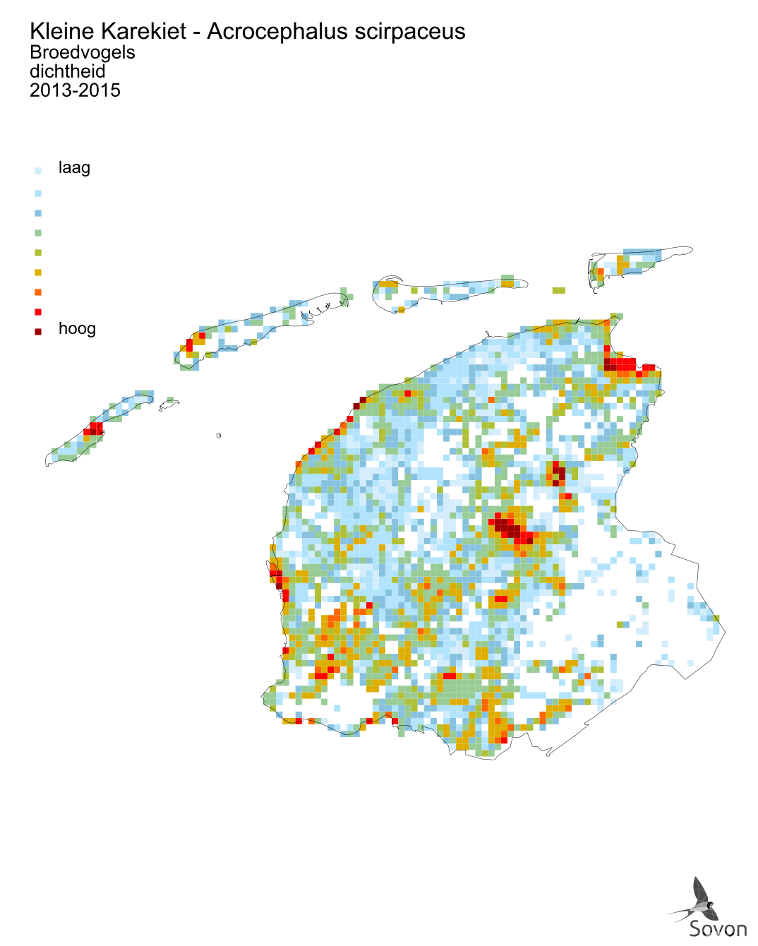 Deze kaart is gebaseerd op de Vogelatlas van Nederland (Sovon 2018). Weergegeven is de relatieve dichtheid per vierkante kilometer.