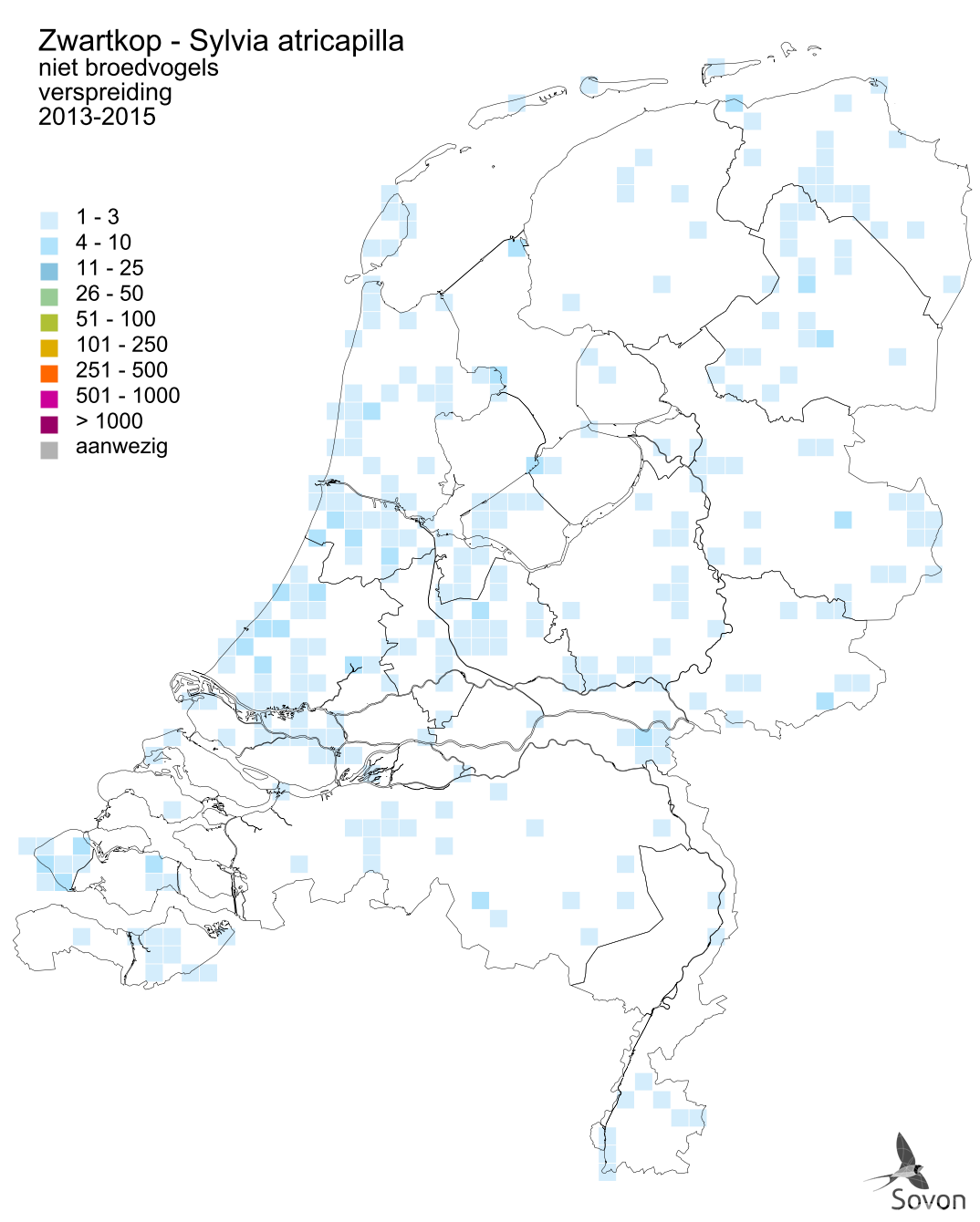 Deze kaart is gebaseerd op de Vogelatlas van Nederland (Sovon 2018). Per atlasblok van 5x5 km is er een schatting van het aantal individuen gegeven.
