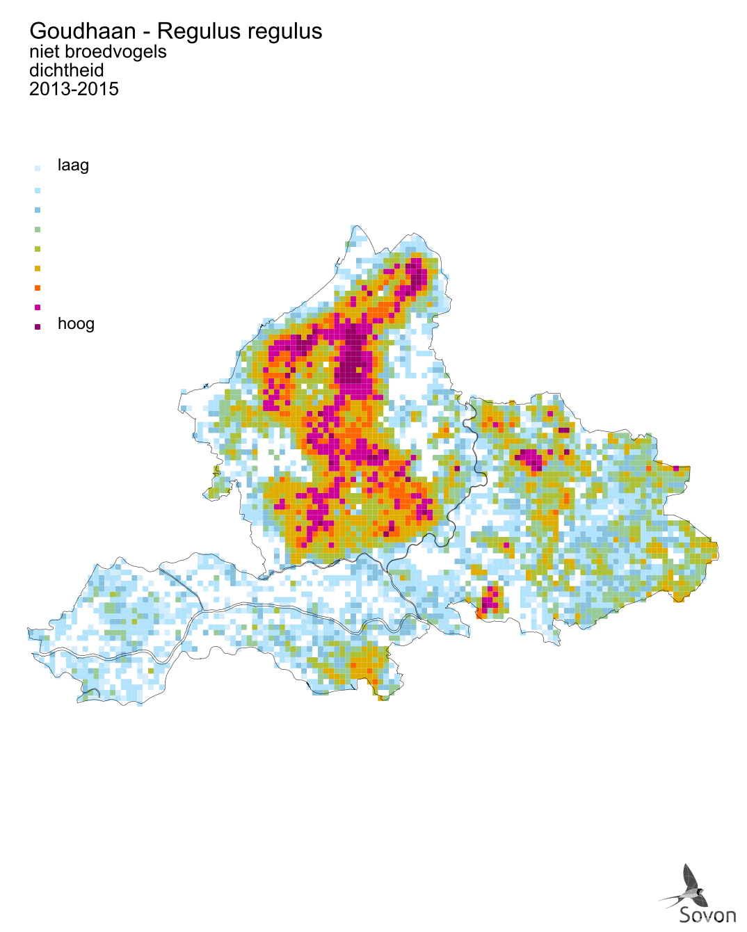 Deze kaart is gebaseerd op de Vogelatlas van Nederland (Sovon 2018). Weergegeven is de relatieve dichtheid per vierkante kilometer.