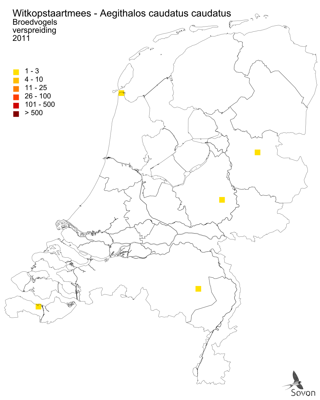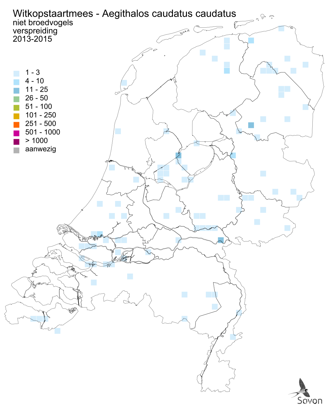 Deze kaart is gebaseerd op de Vogelatlas van Nederland (Sovon 2018). Per atlasblok van 5x5 km is er een schatting van het aantal individuen gegeven.