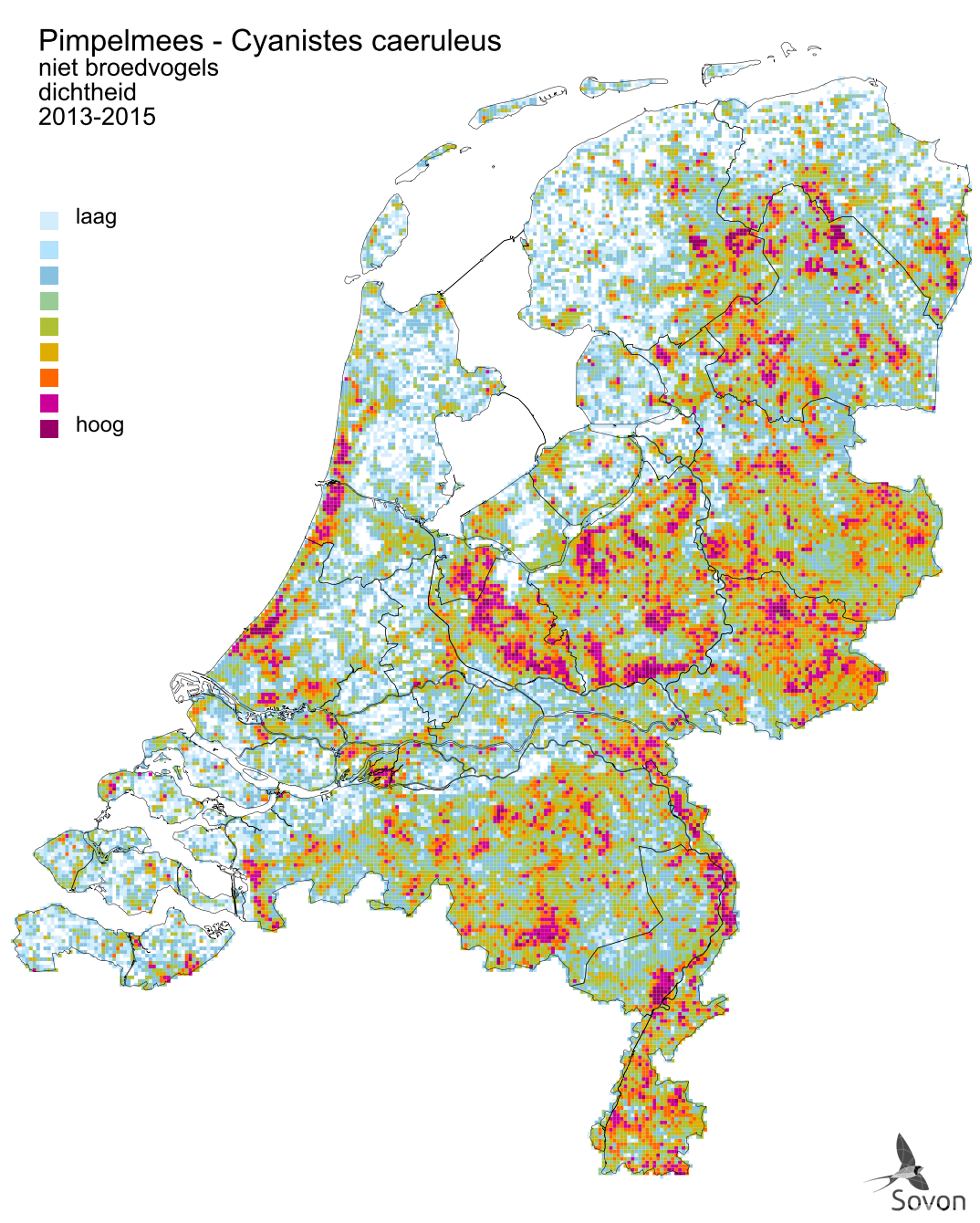 Deze kaart is gebaseerd op de Vogelatlas van Nederland (Sovon 2018). Weergegeven is de relatieve dichtheid per vierkante kilometer.
