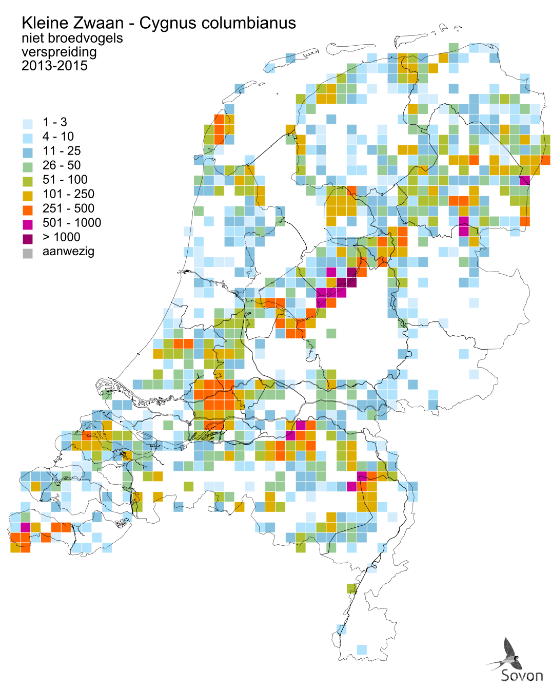 - Groepen soms gemengd met ganzen, andere zwanen, Smienten enz.