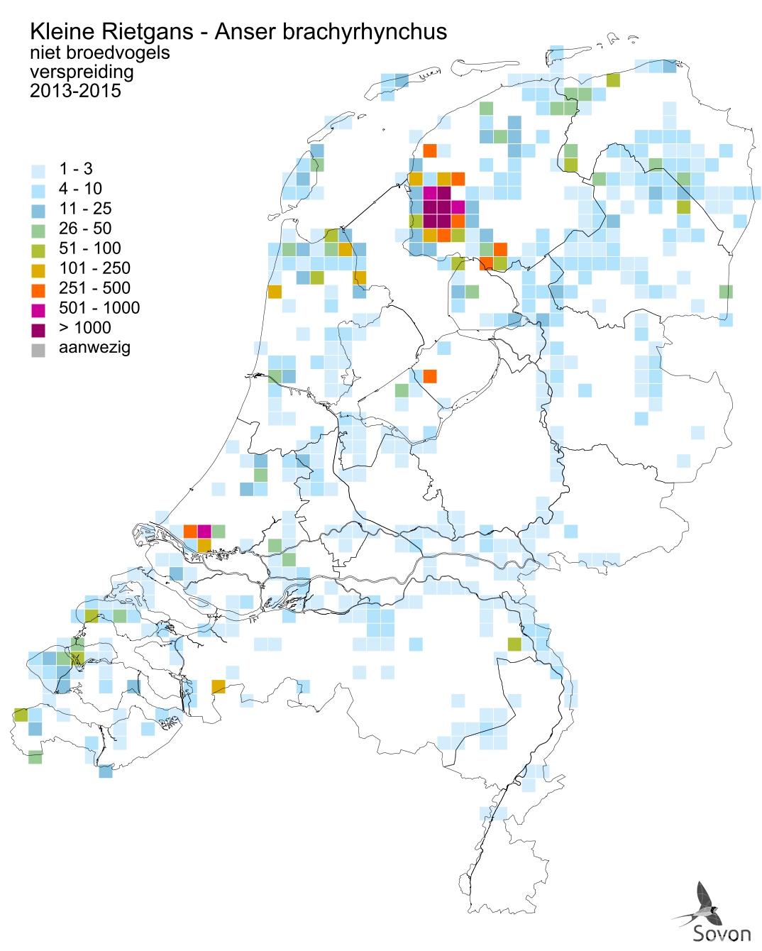 - Op vaste pleisterplaatsen in Friesland meestal in enkele grote concentraties (vaak >1000 vogels), soms gemengd met Kolgans of Brandgans.