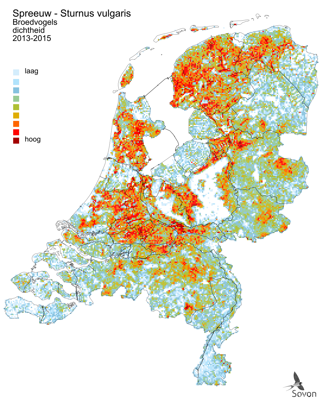 This map is derived from the Bird Atlas of the Netherlands (Sovon 2018). Shown is the relative density of breeding pairs per square kilometer.