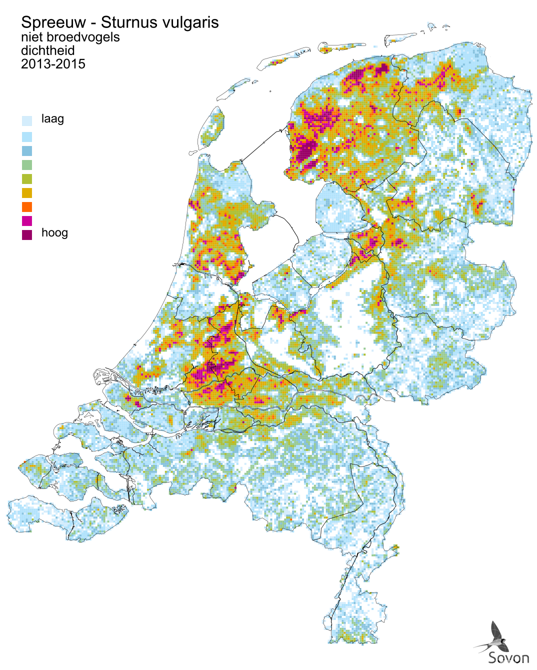 This map is derived from the Bird Atlas of the Netherlands (Sovon 2018). Shown is the relative density of wintering birds per square kilometer.