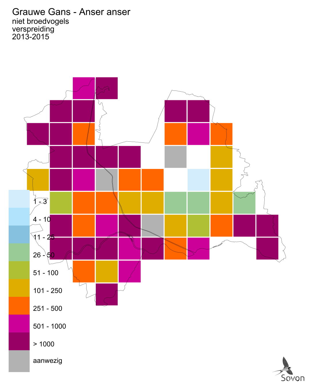 Deze kaart is gebaseerd op de Vogelatlas van Nederland (Sovon 2018). Per atlasblok van 5x5 km is er een schatting van het aantal individuen gegeven.