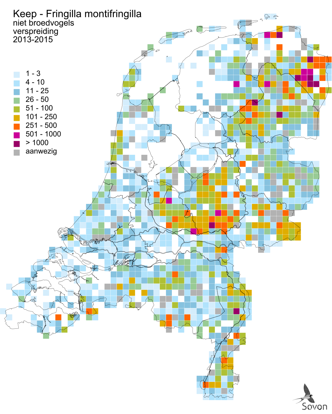 Deze kaart is gebaseerd op de Vogelatlas van Nederland (Sovon 2018). Per atlasblok van 5x5 km is er een schatting van het aantal individuen gegeven.