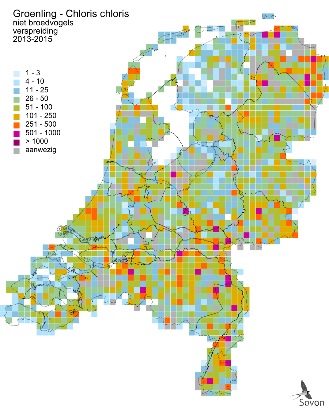 Deze kaart is gebaseerd op de Vogelatlas van Nederland (Sovon 2018). Per atlasblok van 5x5 km is er een schatting van het aantal individuen gegeven.