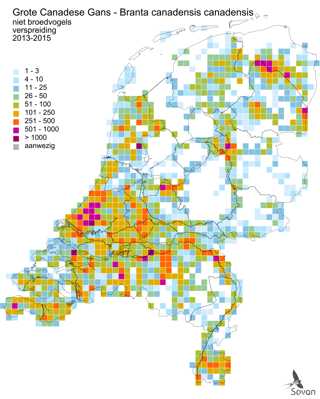 Deze kaart is gebaseerd op de Vogelatlas van Nederland (Sovon 2018). Per atlasblok van 5x5 km is er een schatting van het aantal individuen gegeven.