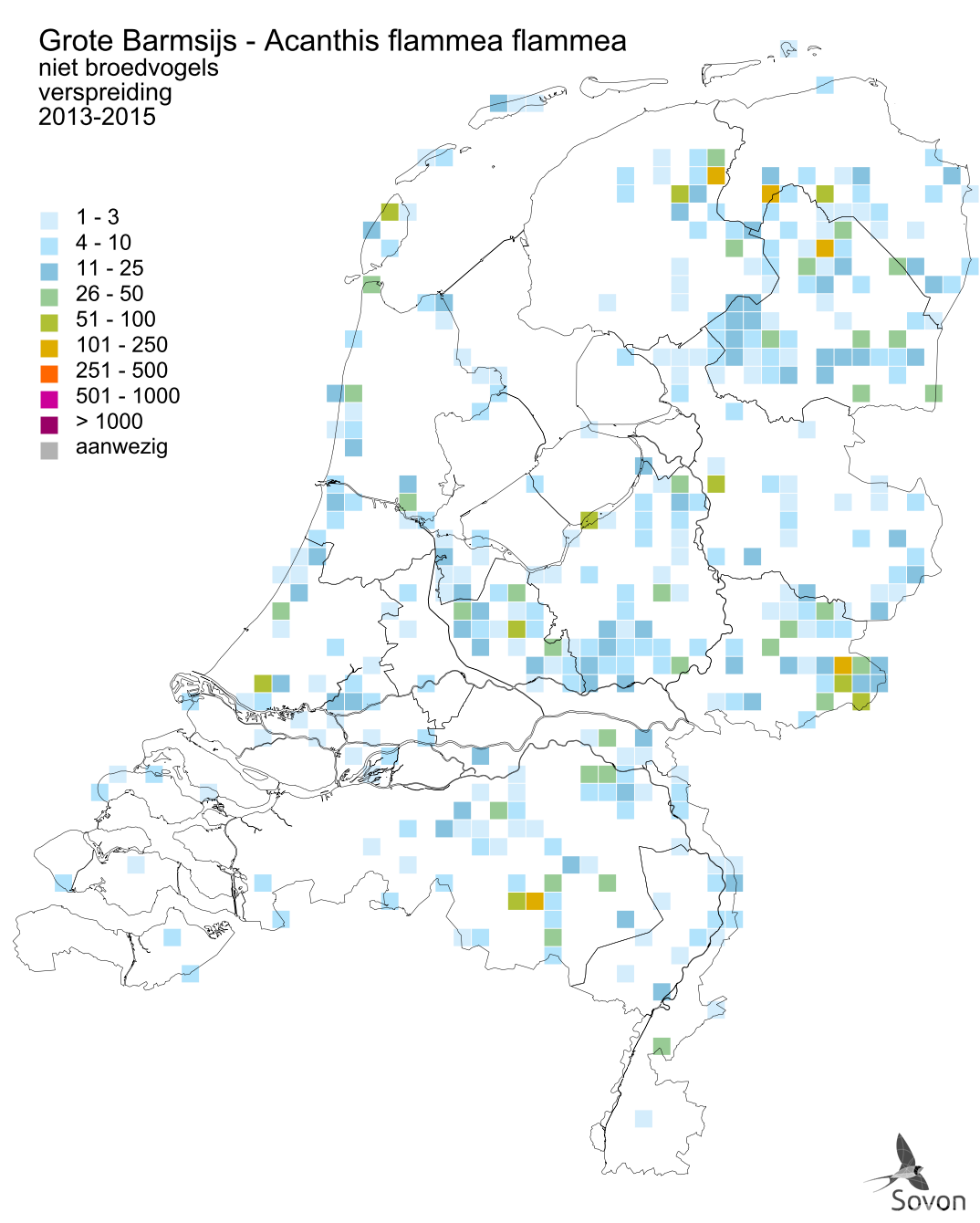 This map is derived from the Bird Atlas of the Netherlands (Sovon 2018). For each atlas square of 5x5 km, an estimate for the number of wintering birds is given.