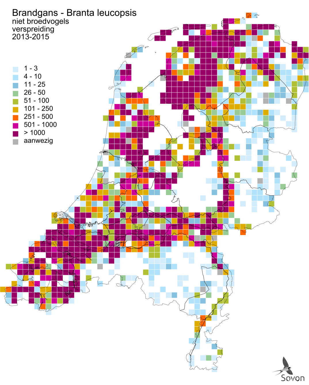 This map is derived from the Bird Atlas of the Netherlands (Sovon 2018). For each atlas square of 5x5 km, an estimate for the number of wintering birds is given.