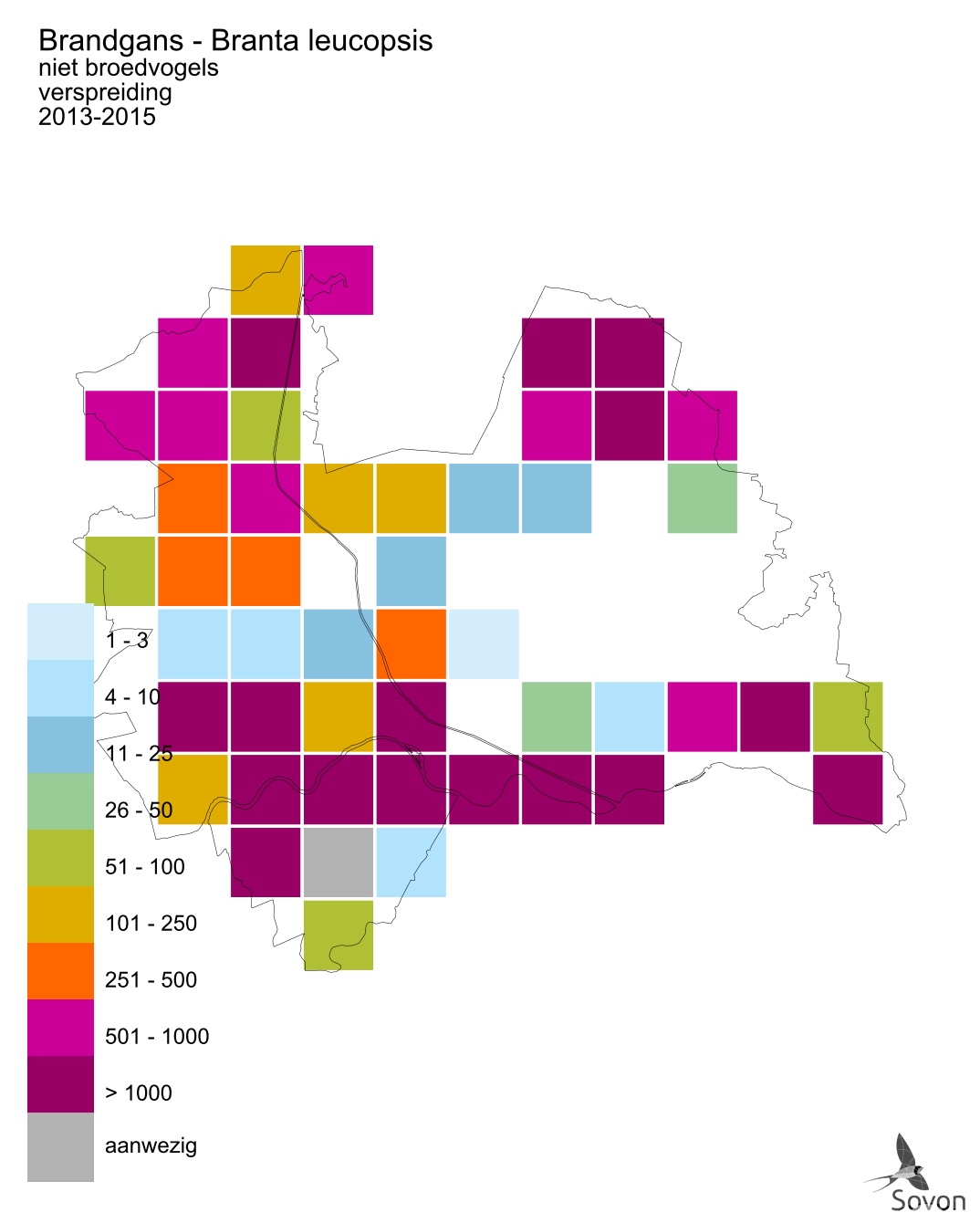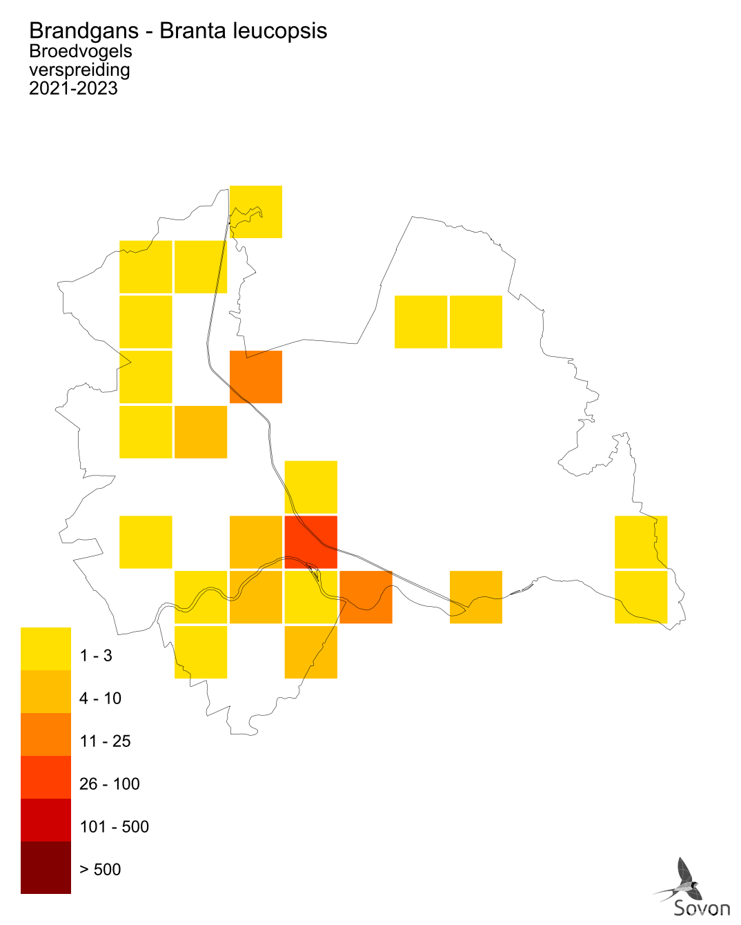 Deze kaart is gebaseerd op de Vogelatlas van Nederland (Sovon 2018). Per atlasblok van 5x5 km is er een schatting van het aantal individuen gegeven.