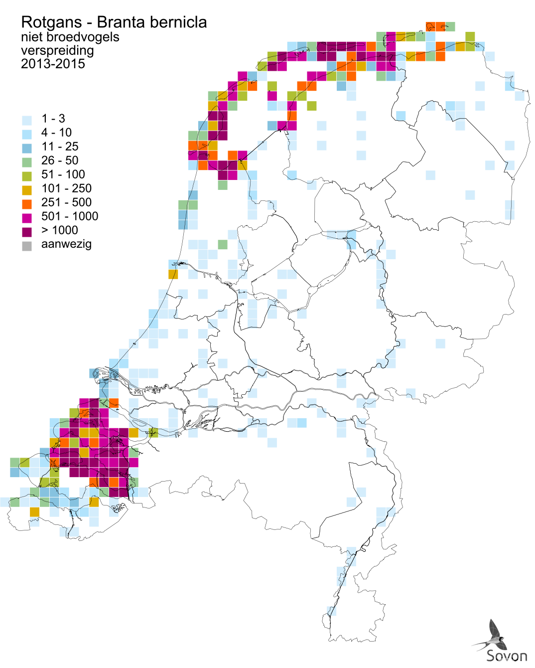 Deze kaart is gebaseerd op de Vogelatlas van Nederland (Sovon 2018). Per atlasblok van 5x5 km is er een schatting van het aantal individuen gegeven.