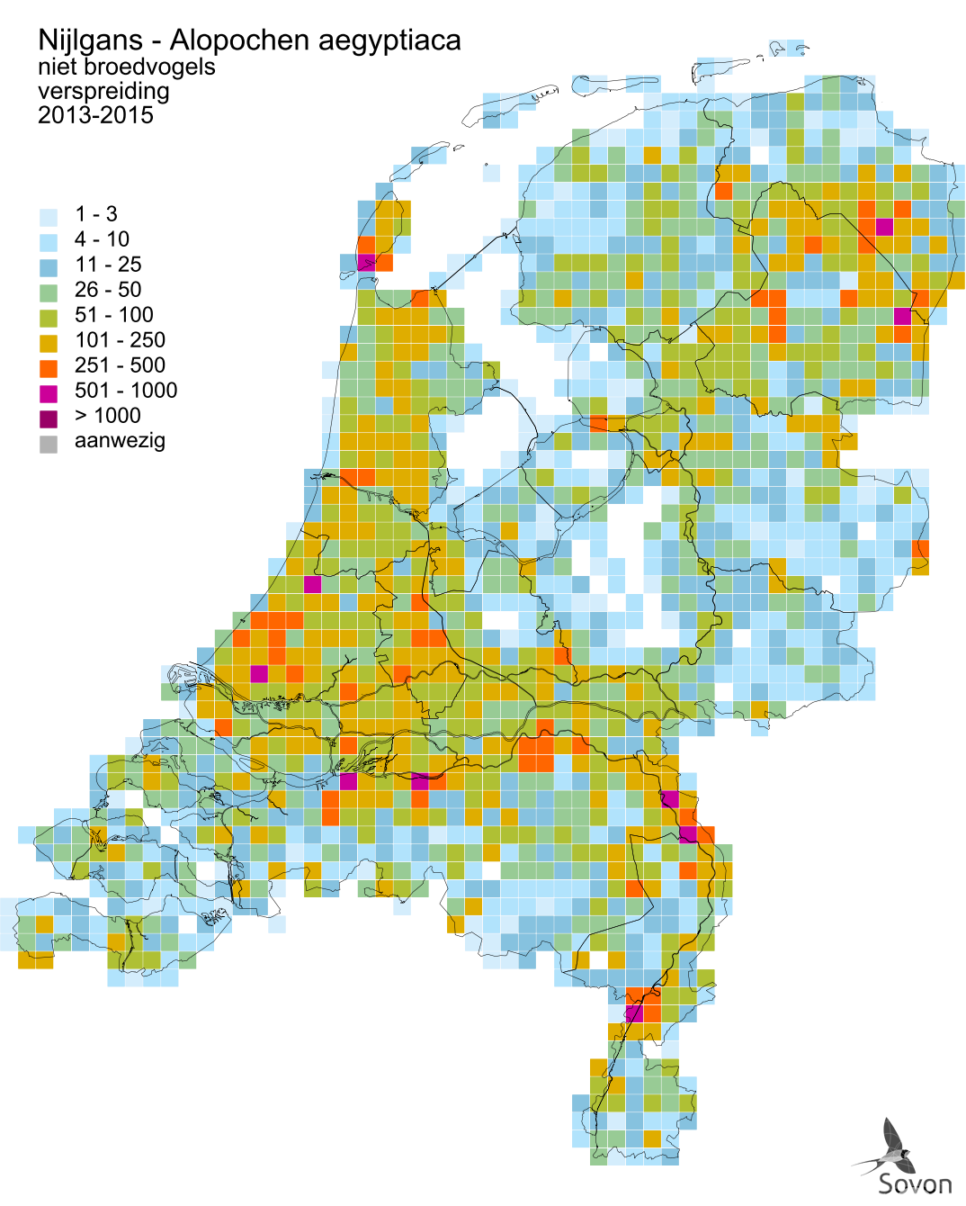 Nijlganzen, afstammelingen van losgelaten of ontsnapte siervogels, zijn een bekende verschijning in het landschap. Toch deden ze pas in 1967 hun intrede als broedvogel. Vanuit verspreidingskernen bij Den Haag, Groningen en in het oostelijk Rivierengebied koloniseerden ze grote delen van het land. De hoogste dichtheden vinden we in graslandgebieden met waterpartijen in de laaggelegen delen van vooral West-Nederland en het rivierengebied. De Nijlgans komt in toenemende mate tot broeden in stedelijk gebied en zelfs tot diep in grote bossen, op onder andere gekraakte roofvogelnesten. Het succes van deze soort is deels een gevolg van het lange broedseizoen met meerdere broedsels per jaar, tot midden in de winter. Nijlganzen verdedigen zich fel tegen predatoren of andere indringers. Toch zijn er tot dusverre geen aanwijzingen dat dit ten koste van andere watervogelpopulaties gaat.