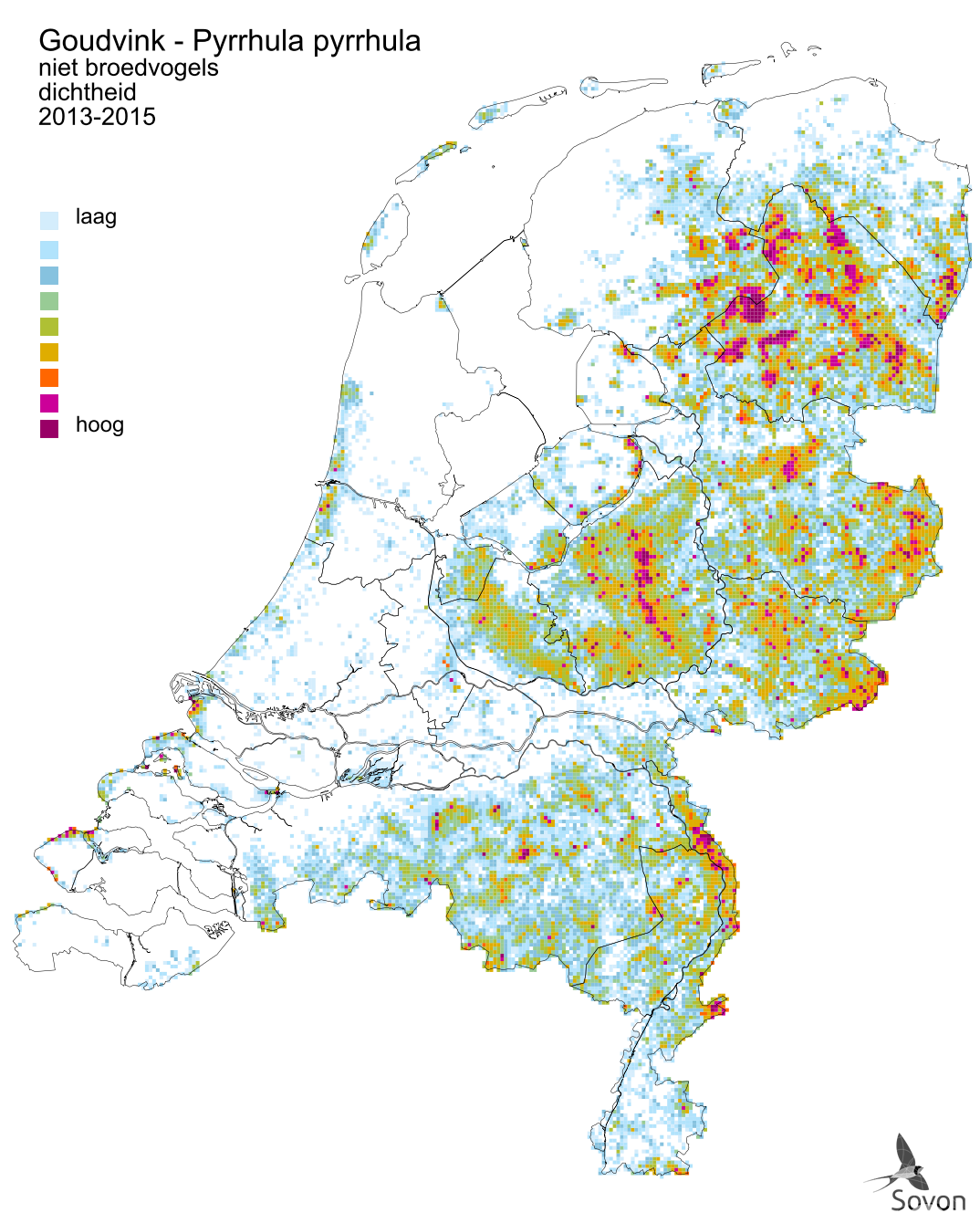 Deze kaart is gebaseerd op de Vogelatlas van Nederland (Sovon 2018). Weergegeven is de relatieve dichtheid per vierkante kilometer.