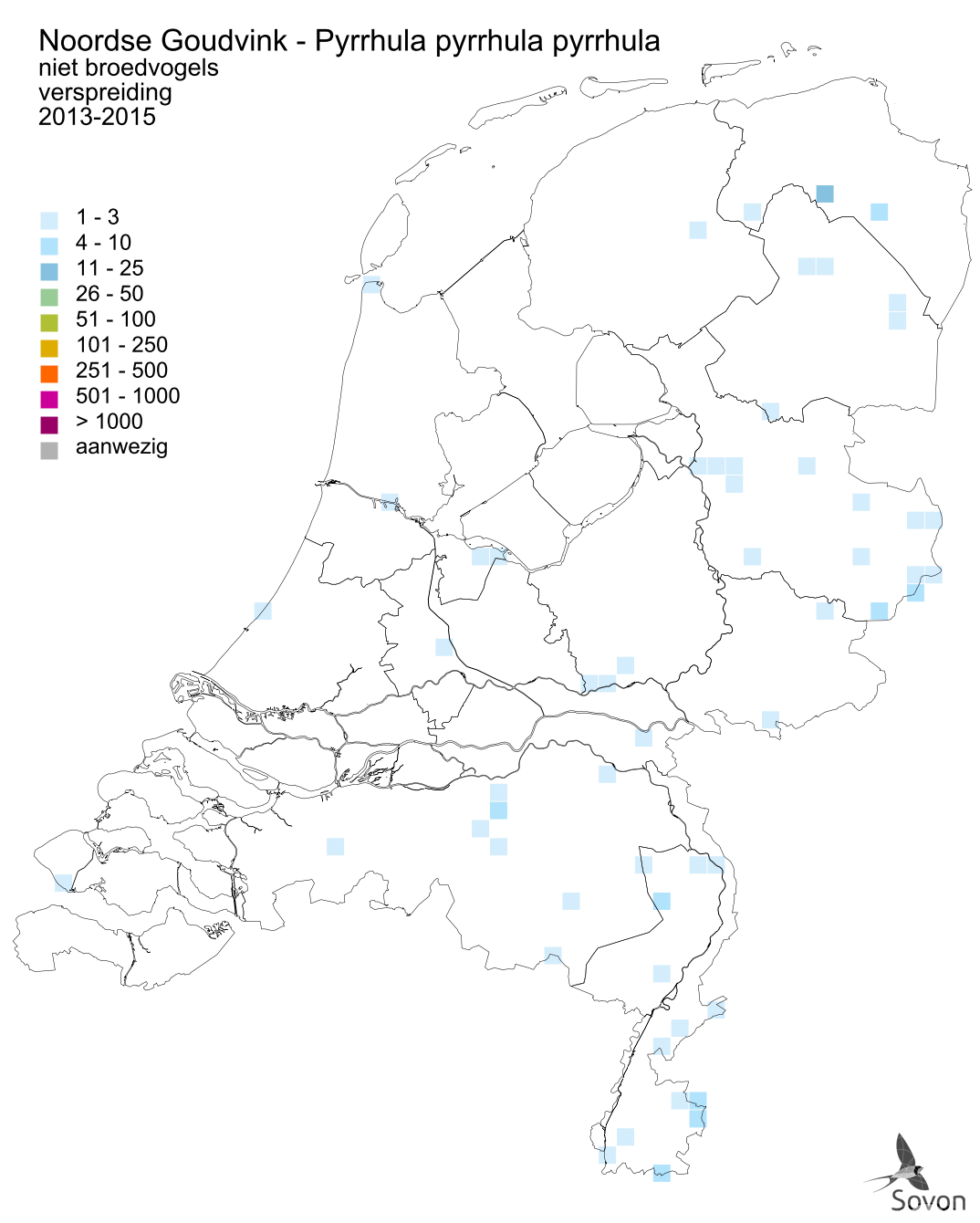 Deze kaart is gebaseerd op de Vogelatlas van Nederland (Sovon 2018). Per atlasblok van 5x5 km is er een schatting van het aantal individuen gegeven.