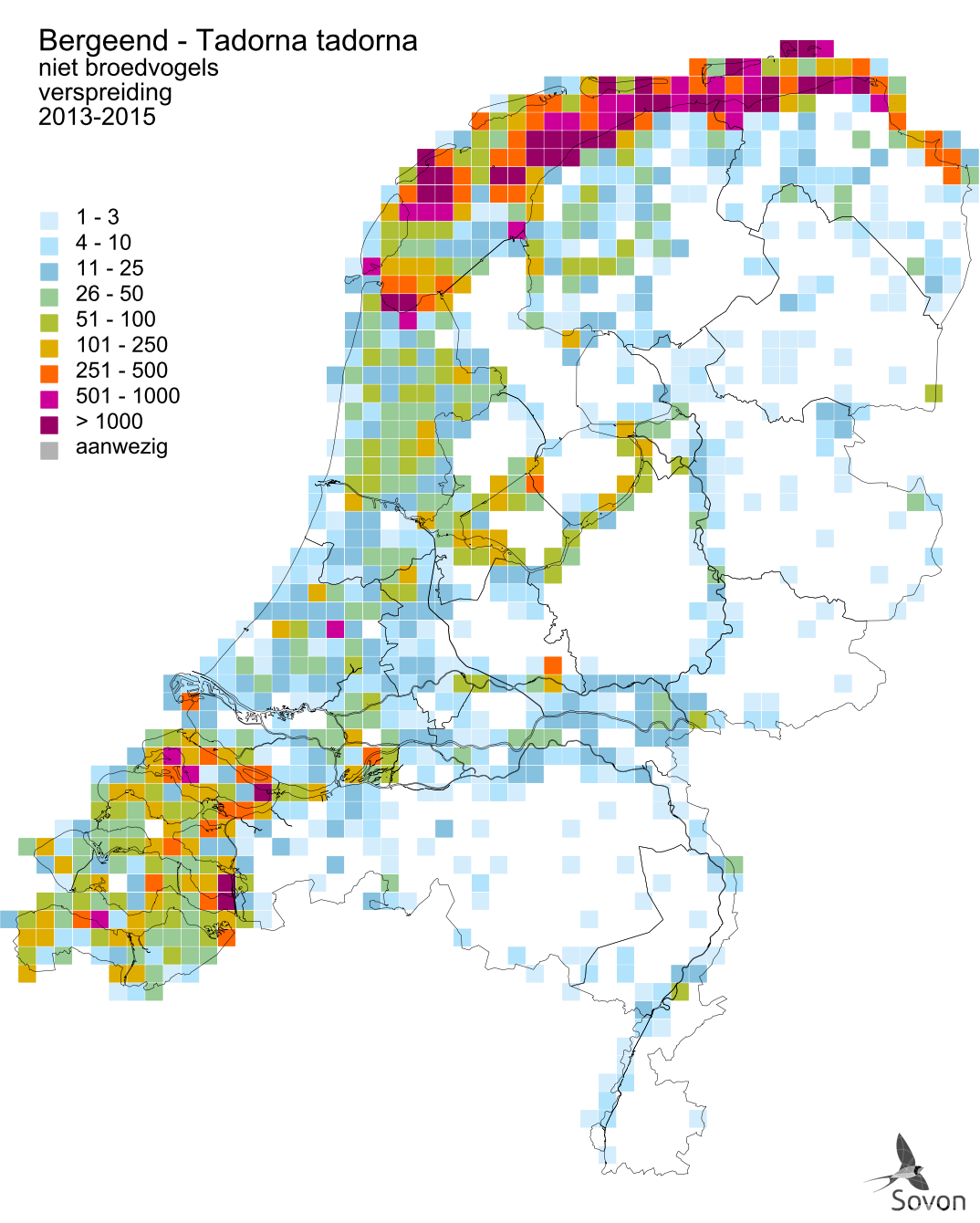 Deze kaart is gebaseerd op de Vogelatlas van Nederland (Sovon 2018). Per atlasblok van 5x5 km is er een schatting van het aantal individuen gegeven.