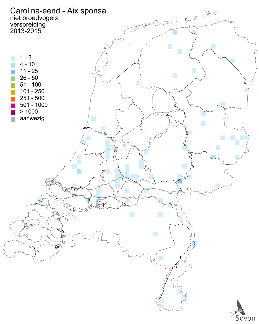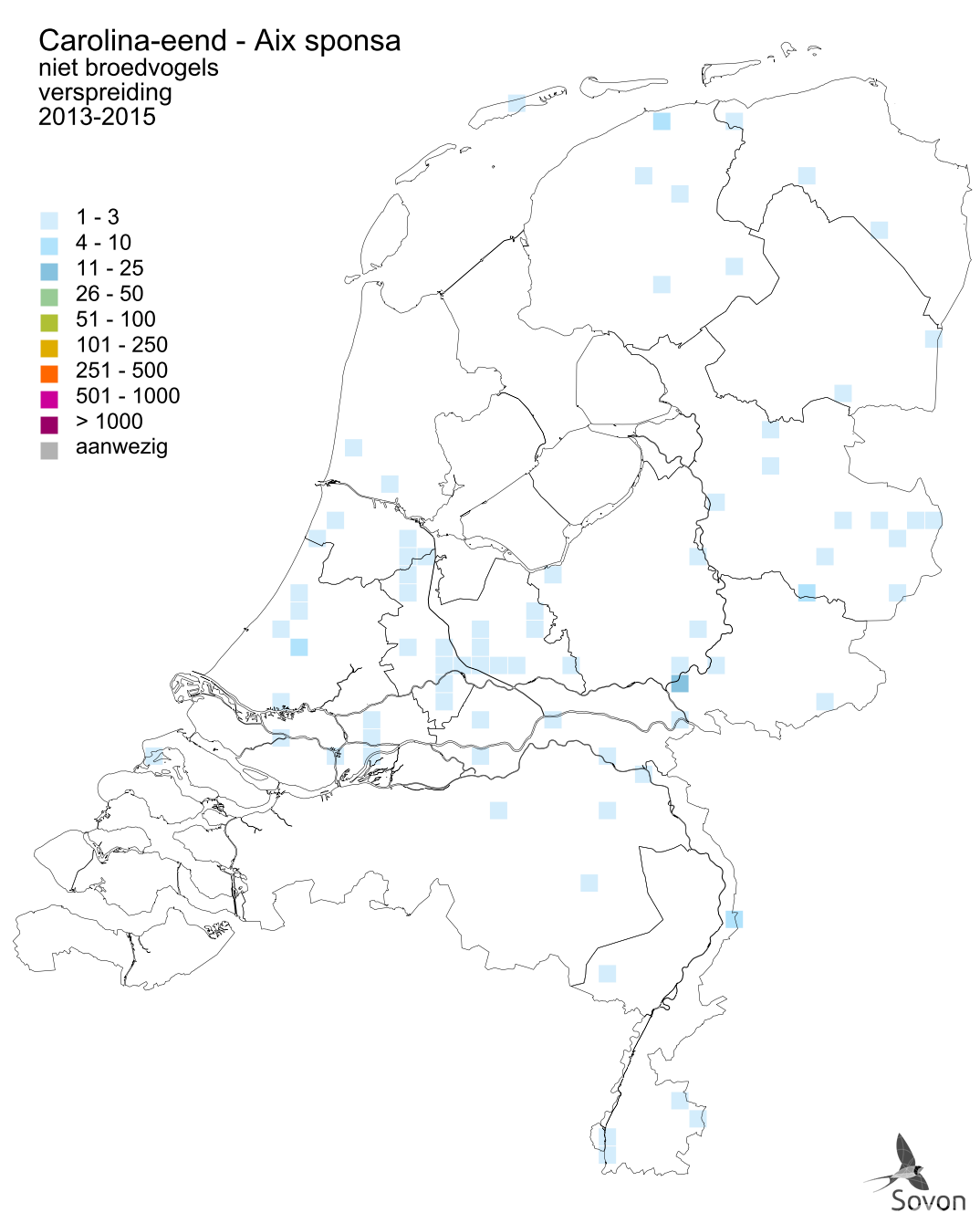 Deze kaart is gebaseerd op de Vogelatlas van Nederland (Sovon 2018). Per atlasblok van 5x5 km is er een schatting van het aantal individuen gegeven.