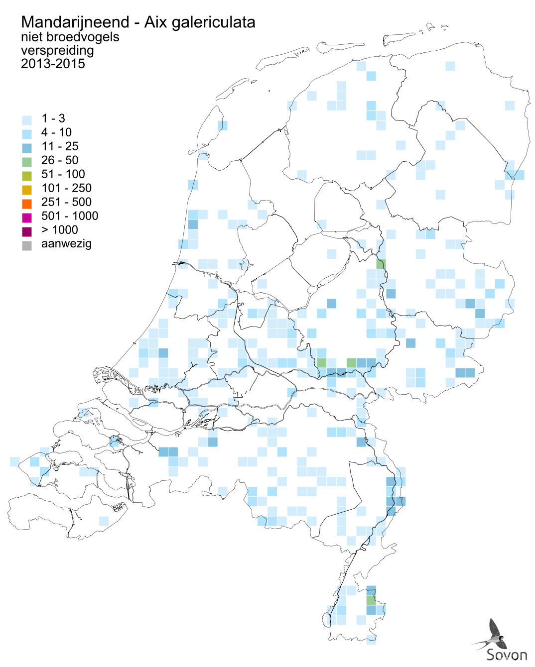 Uit collecties ontsnapte Mandarijneenden en hun nazaten broeden in Nederland vanaf ongeveer 1970. De landelijke aantallen zijn toegenomen van een tiental broedparen rond 1980 naar rond 250 in 2000 en nog wat meer daarna. De verspreiding kent zwaartepunten op de noordoostelijke en zuidelijke Veluwe, in de Betuwe, op de Utrechtse Heuvelrug en in Midden-Limburg. Als bewoner van grote holen, bijvoorbeeld oude nesten van Zwarte Specht, komt de Mandarijneend ook in bossen voor, nabij bosvijvers of beken.