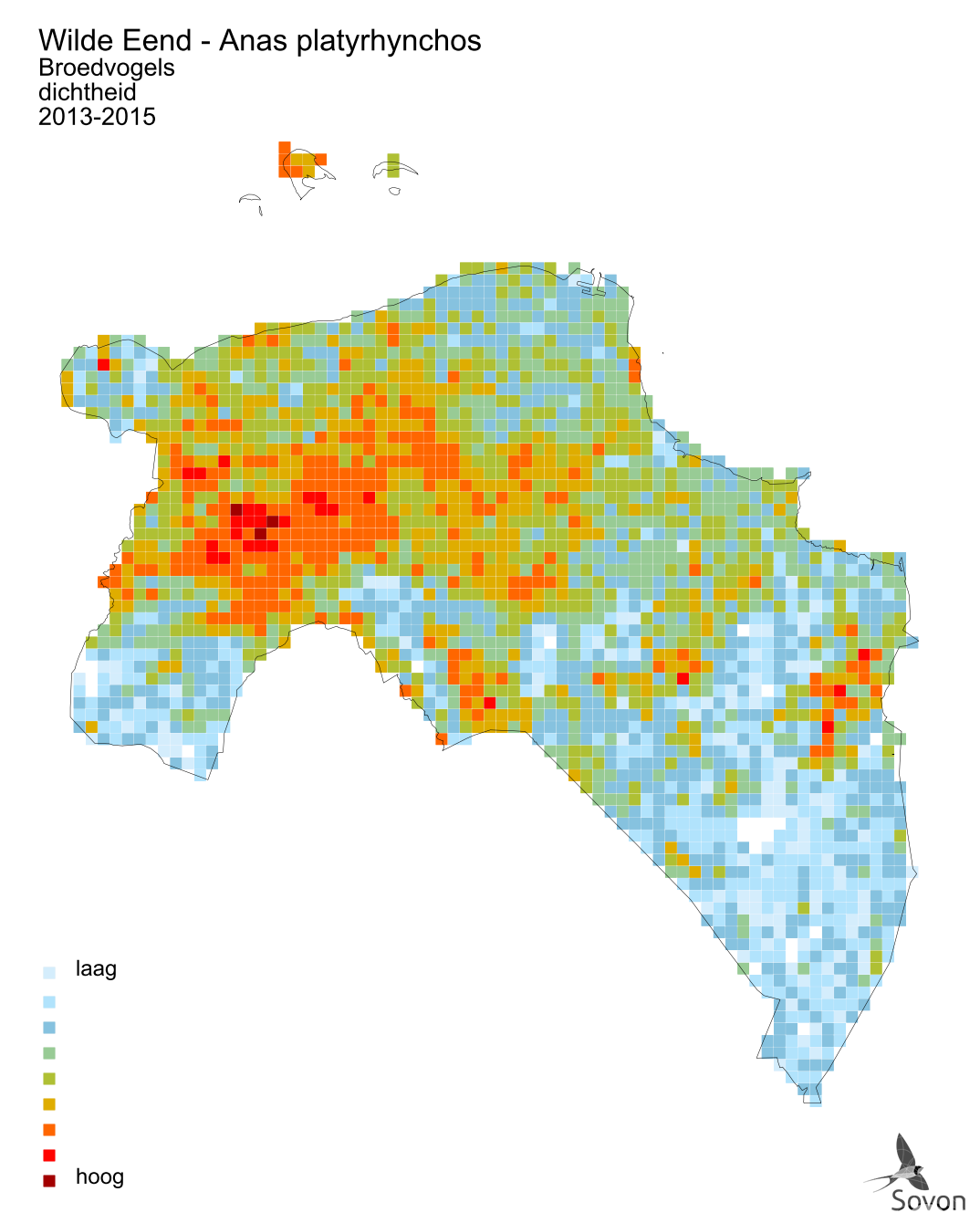 Deze kaart is gebaseerd op de Vogelatlas van Nederland (Sovon 2018). Weergegeven is de relatieve dichtheid per vierkante kilometer.