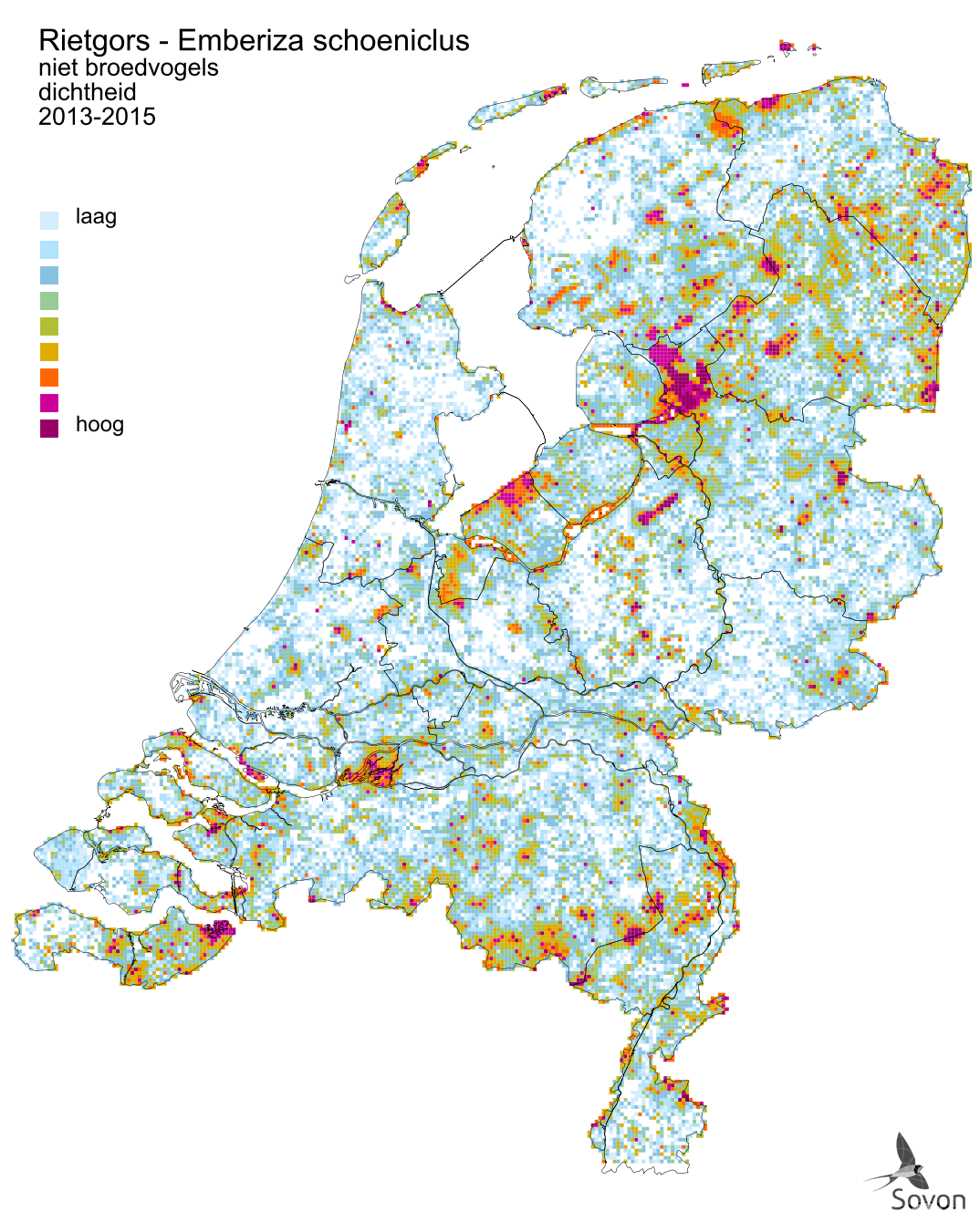 This map is derived from the Bird Atlas of the Netherlands (Sovon 2018). Shown is the relative density of wintering birds per square kilometer.