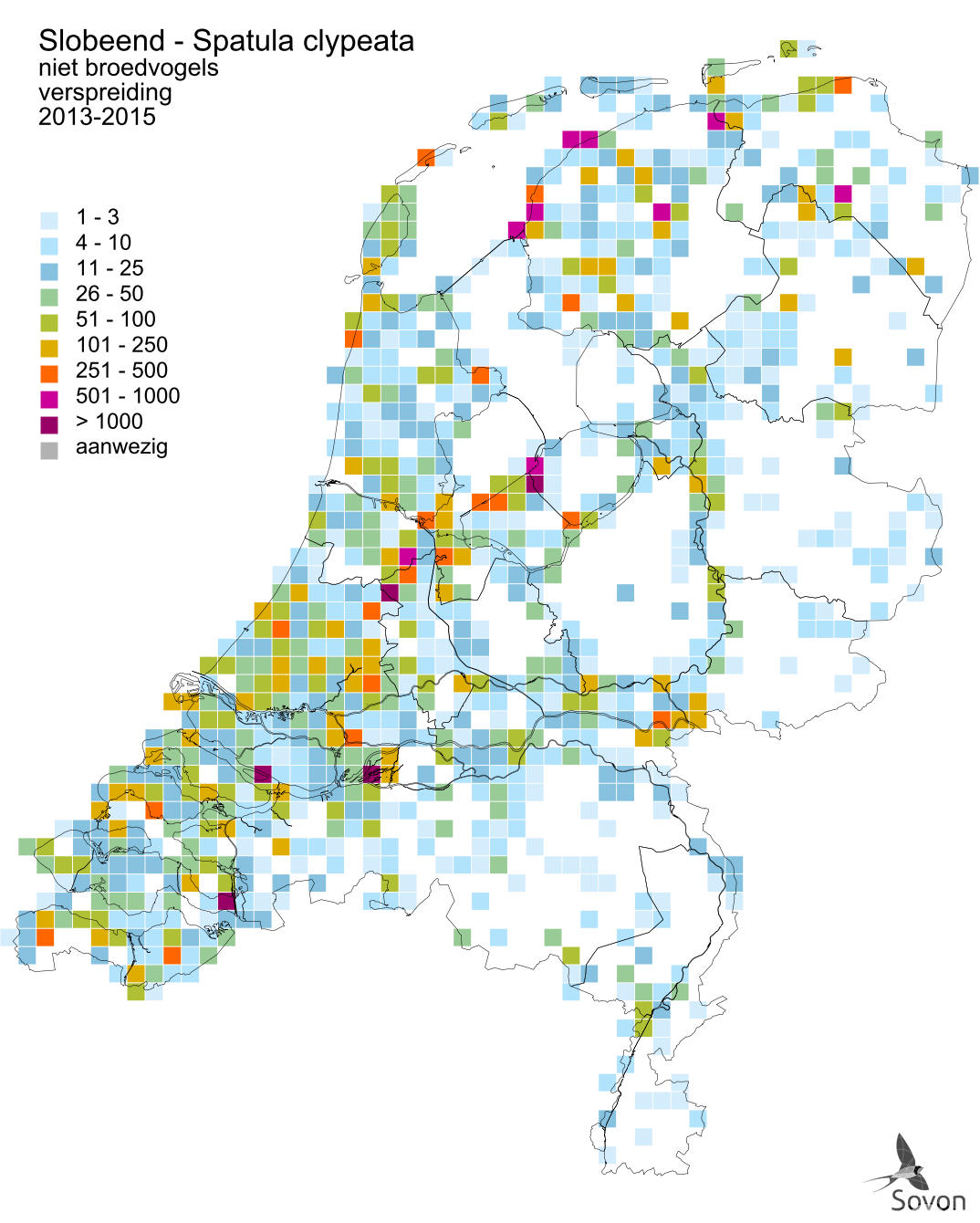 Deze kaart is gebaseerd op de Vogelatlas van Nederland (Sovon 2018). Per atlasblok van 5x5 km is er een schatting van het aantal individuen gegeven.