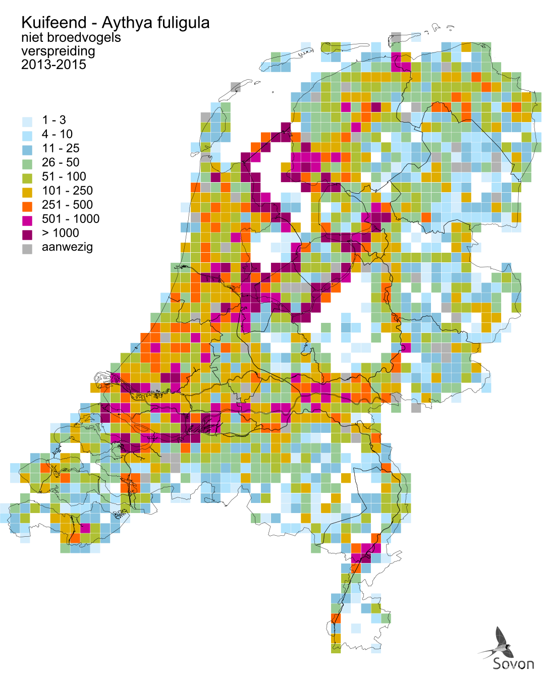 Deze kaart is gebaseerd op de Vogelatlas van Nederland (Sovon 2018). Per atlasblok van 5x5 km is er een schatting van het aantal individuen gegeven.