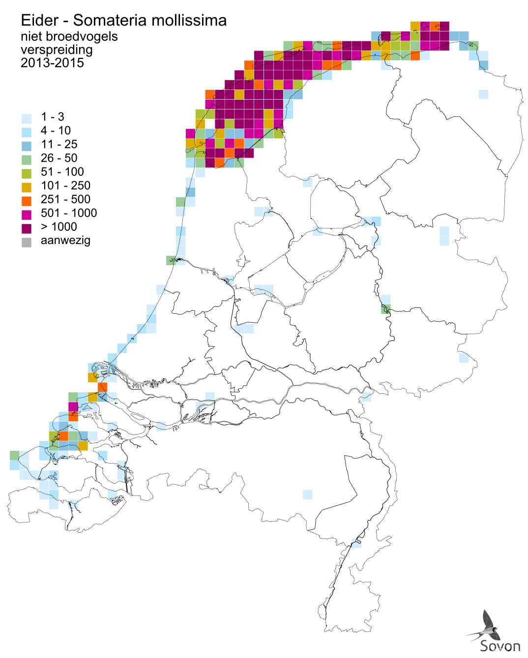 - In Waddengebied (en soms Noordzee) in groepen tot vele honderden