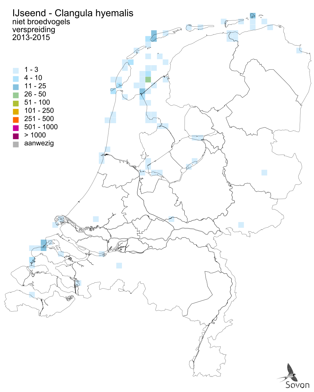 Deze kaart is gebaseerd op de Vogelatlas van Nederland (Sovon 2018). Per atlasblok van 5x5 km is er een schatting van het aantal individuen gegeven.