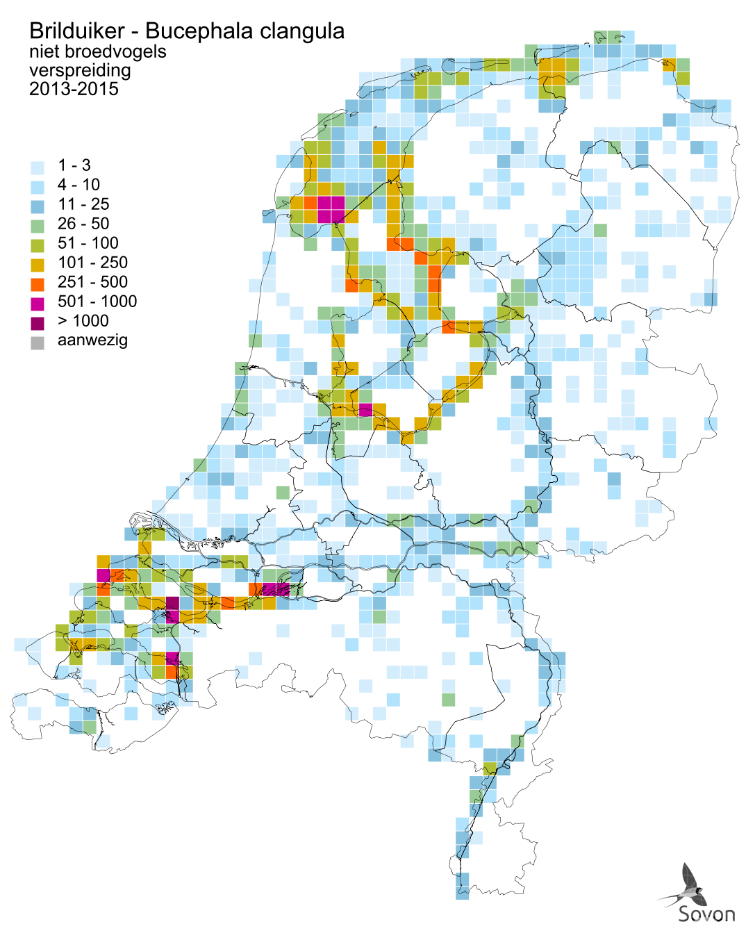 Deze kaart is gebaseerd op de Vogelatlas van Nederland (Sovon 2018). Per atlasblok van 5x5 km is er een schatting van het aantal individuen gegeven.