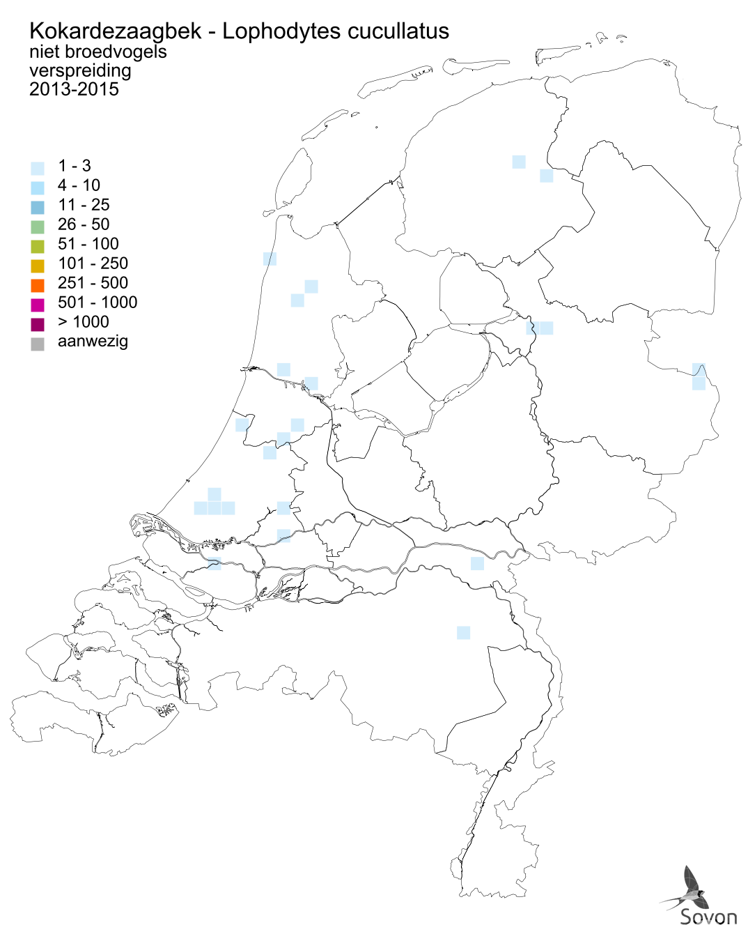 Deze kaart is gebaseerd op de Vogelatlas van Nederland (Sovon 2018). Per atlasblok is aangegeven of de soort er voorkomt en welke zekerheid omtrent broeden werd verkregen.