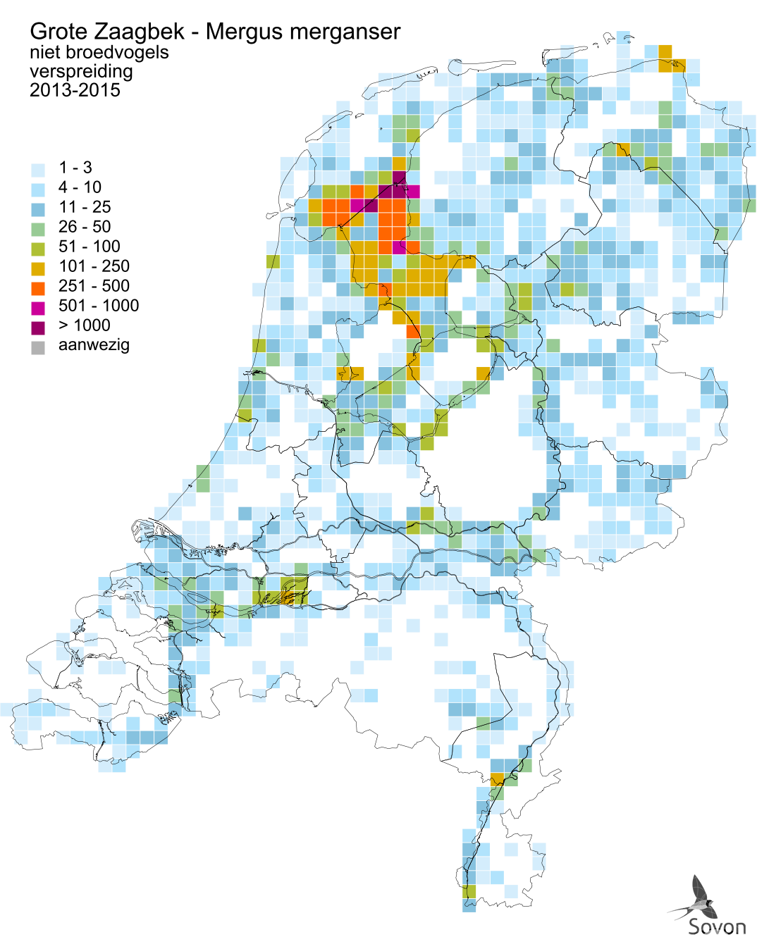 Deze kaart is gebaseerd op de Vogelatlas van Nederland (Sovon 2018). Per atlasblok van 5x5 km is er een schatting van het aantal individuen gegeven.