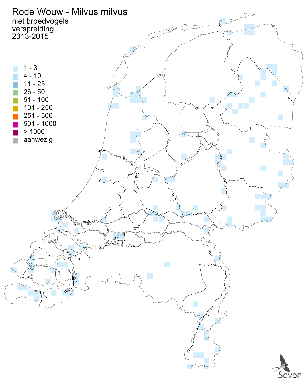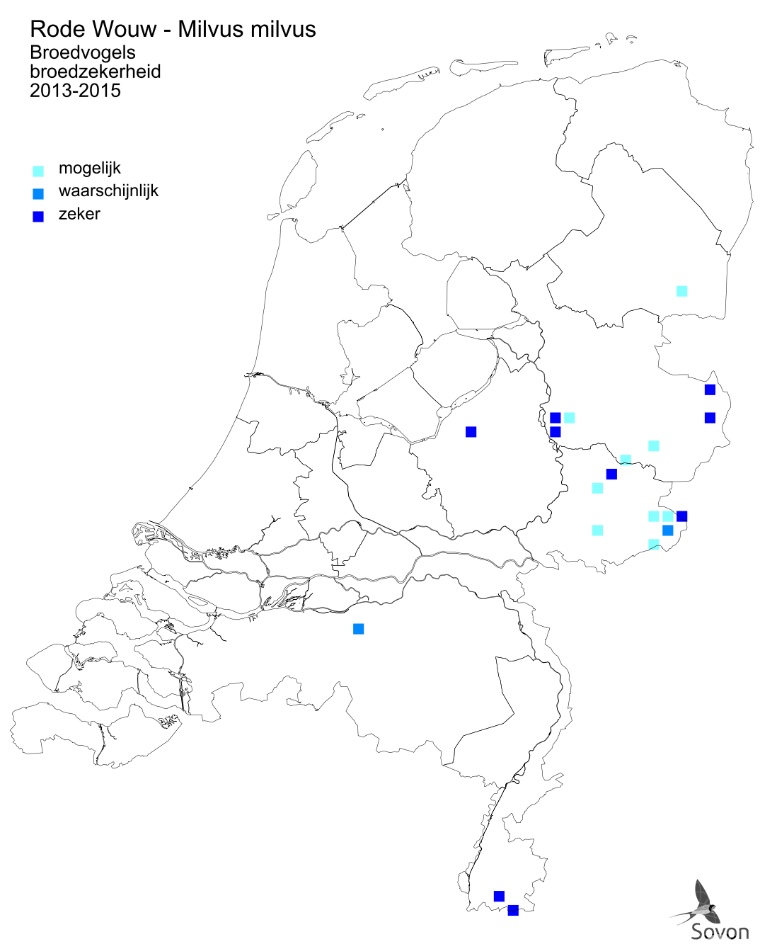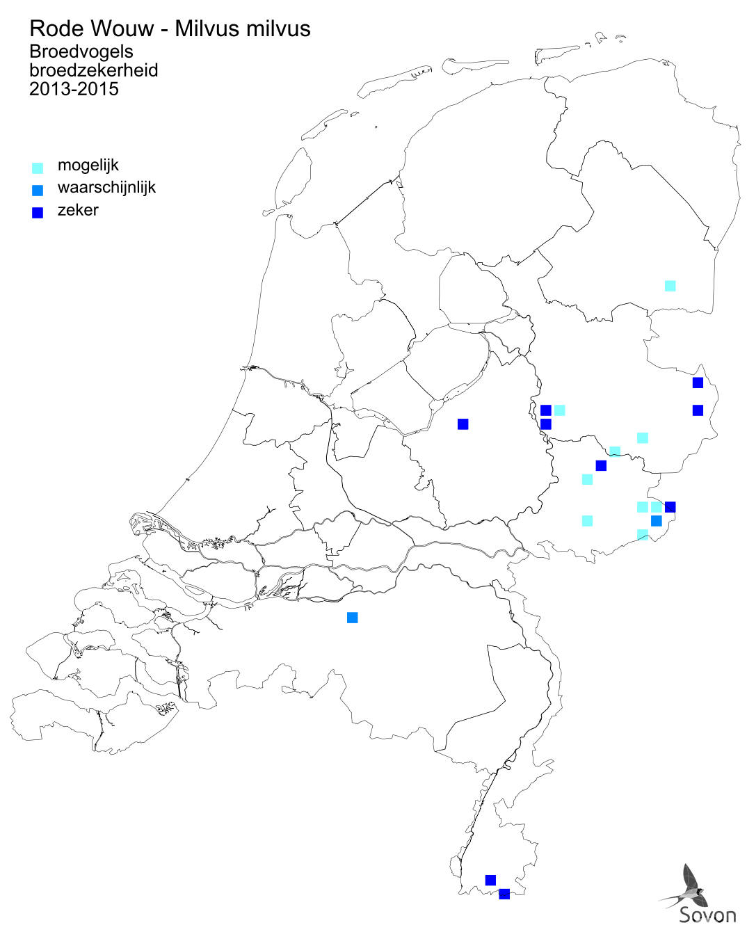 Deze kaart is gebaseerd op de Vogelatlas van Nederland (Sovon 2018). Per atlasblok is aangegeven of de soort er voorkomt en welke zekerheid omtrent broeden werd verkregen.