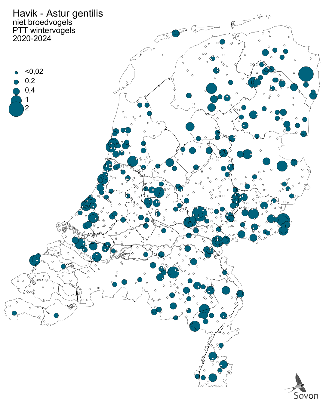Deze kaart is gebaseerd op het Punt Transect Tellingen project (PTT). Weergegeven is het gemiddeld aantal exemplaren per telroute. Routes waar de soort niet is waargenomen zijn apart aangegeven (geen landelijke dekking).