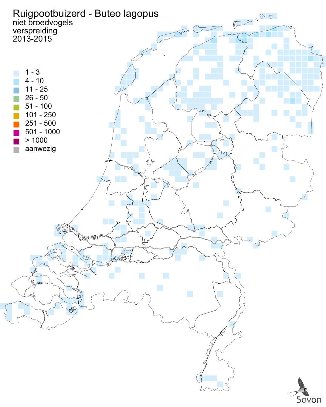 Deze kaart is gebaseerd op de Vogelatlas van Nederland (Sovon 2018). Per atlasblok van 5x5 km is er een schatting van het aantal individuen gegeven.