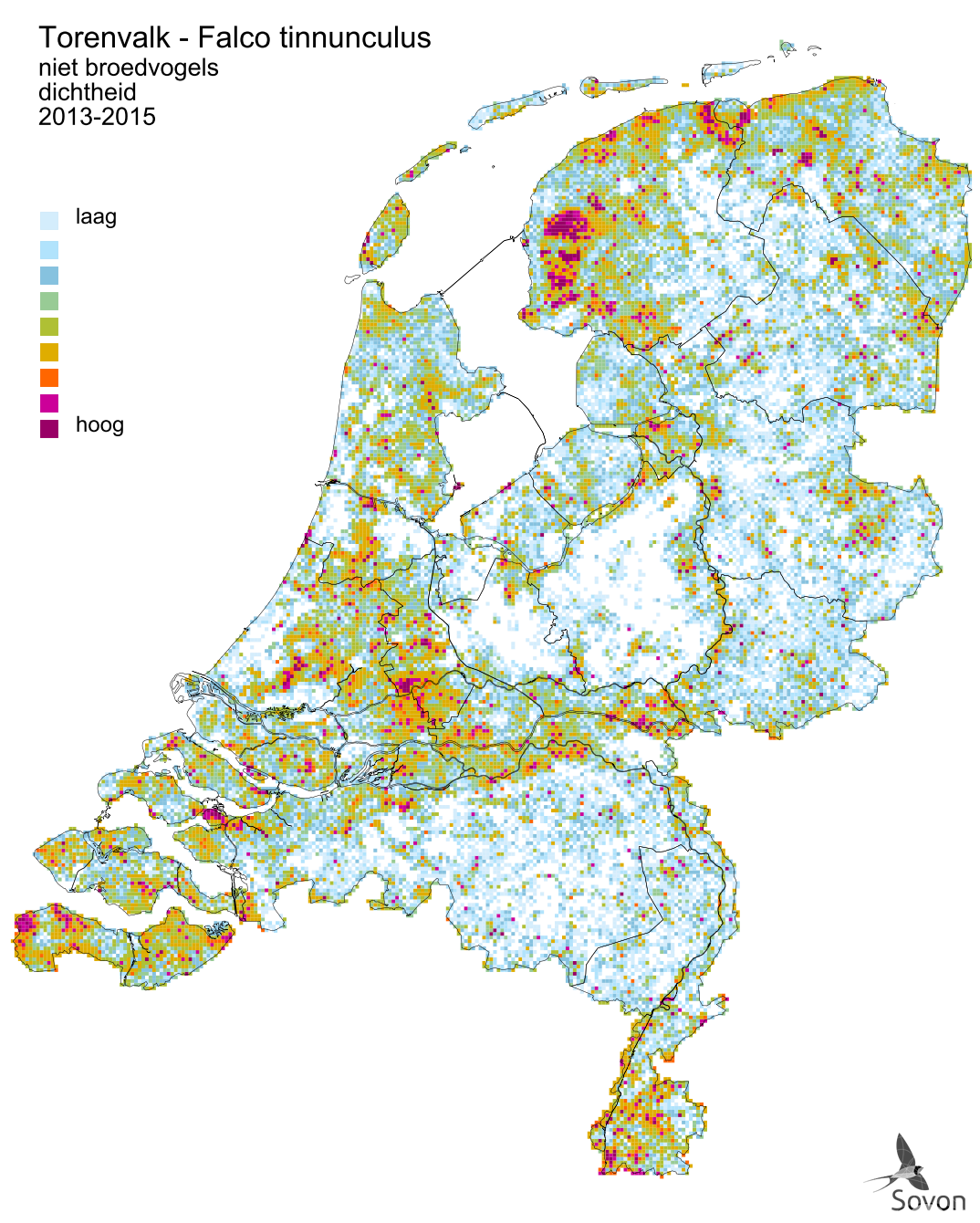 Deze kaart is gebaseerd op de Vogelatlas van Nederland (Sovon 2018). Weergegeven is de relatieve dichtheid per vierkante kilometer.