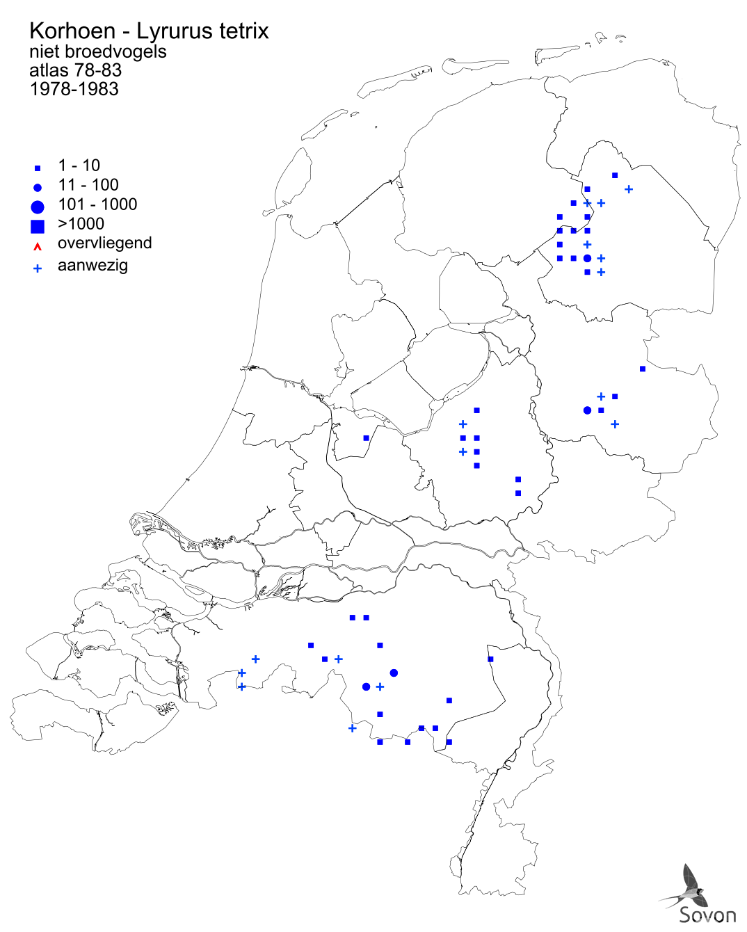 Deze kaart is gebaseerd op de Atlas van de Nederlandse Vogels (1987). Per atlasblok van 5x5 km wordt een schatting van de aanwezige aantallen gegeven.