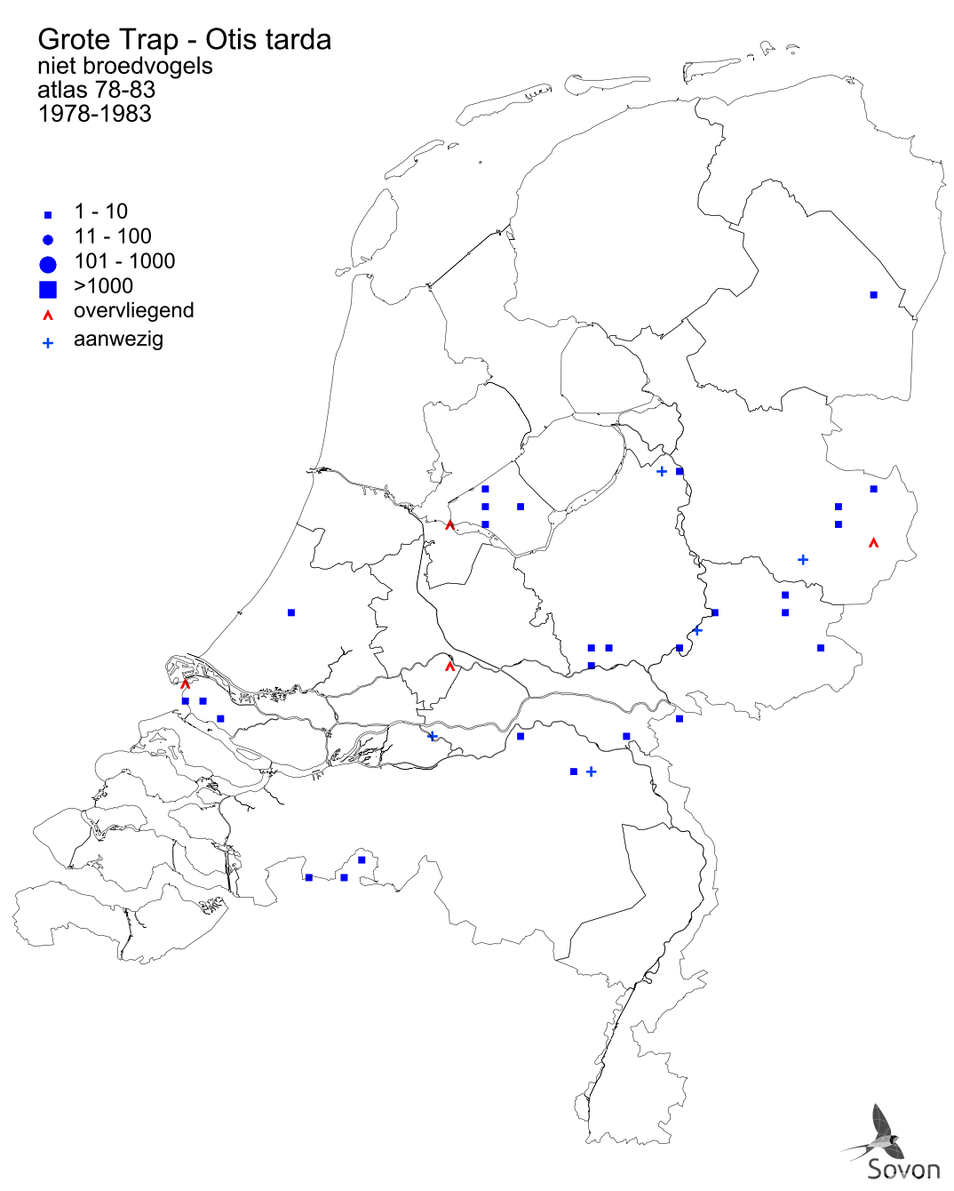 Deze kaart is gebaseerd op de Atlas van de Nederlandse Vogels (1987). Per atlasblok van 5x5 km wordt een schatting van de aanwezige aantallen gegeven.